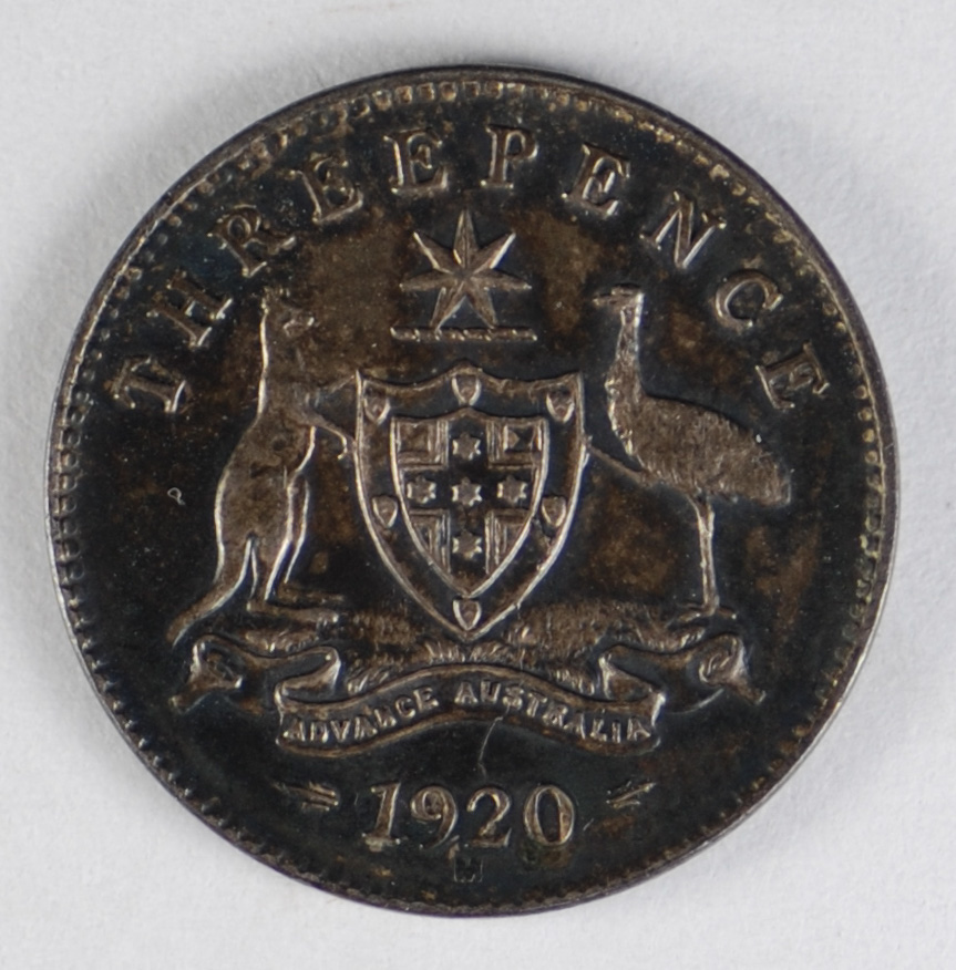 FC | 347 S | 1920-M | AUSTRALIA | 3 Pence | Arms | George V | 0.925 | 0.0393 | Silver | 24 | 3 | Uncirculated | $750.00 |