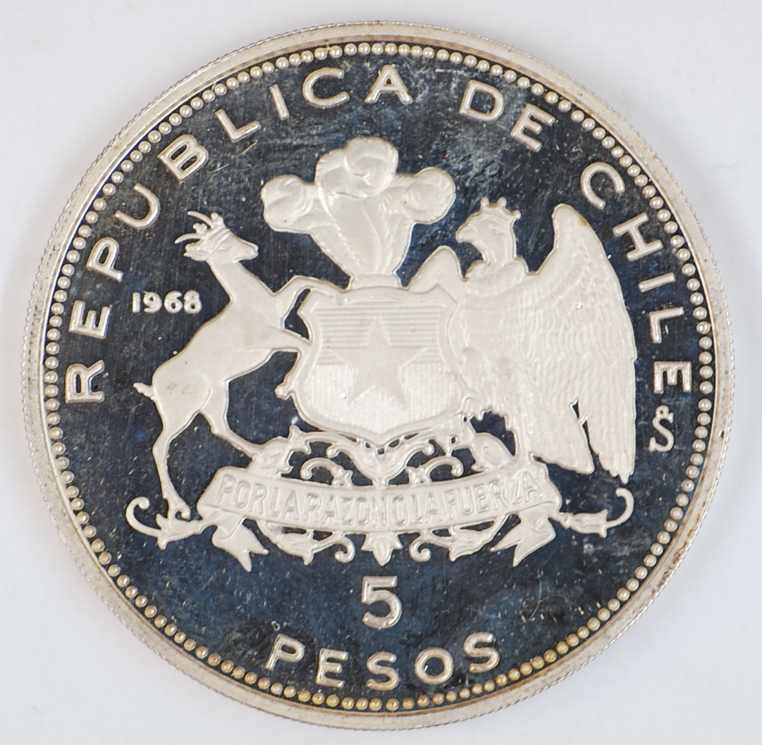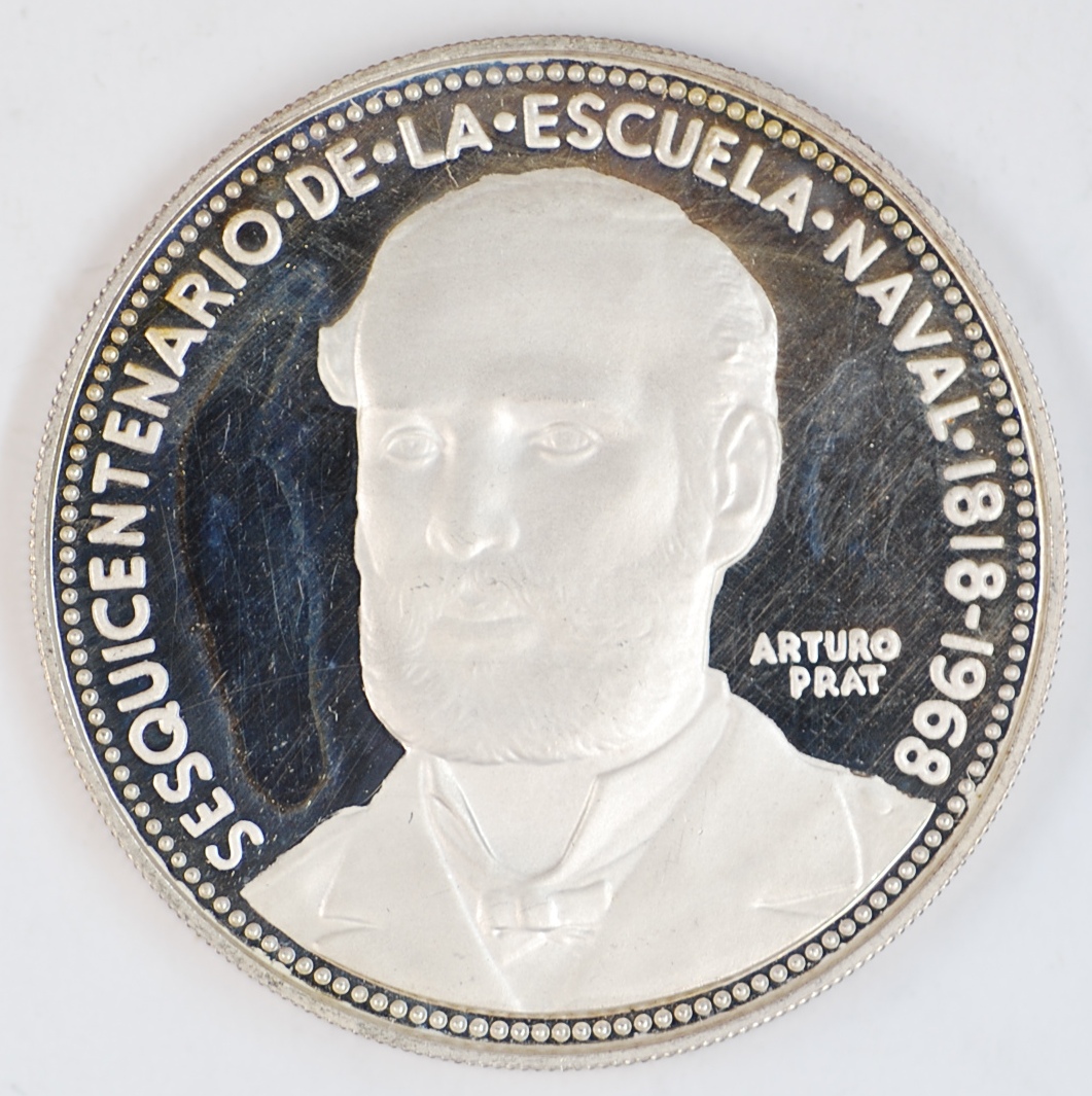 1968 | CHILE | 5 Pesos | Admiral Arturo Prat Chacon | Naval Academy | 0.999 | 0.7226 | Silver | 182 | Proof | $45.00 | ||