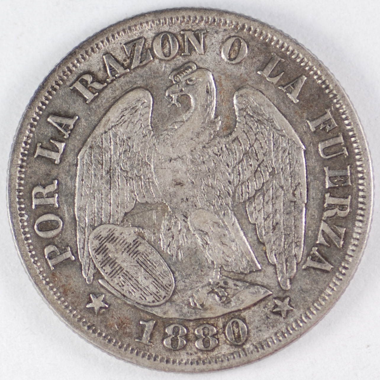 FC | 39056 | 1880 | CHILE | 20 Centavos | Condor with Wings Spread | Plumed Arms | 0.500 | 0.0804 | Silver | 138.2 | Extremely Fine | $10.00 |