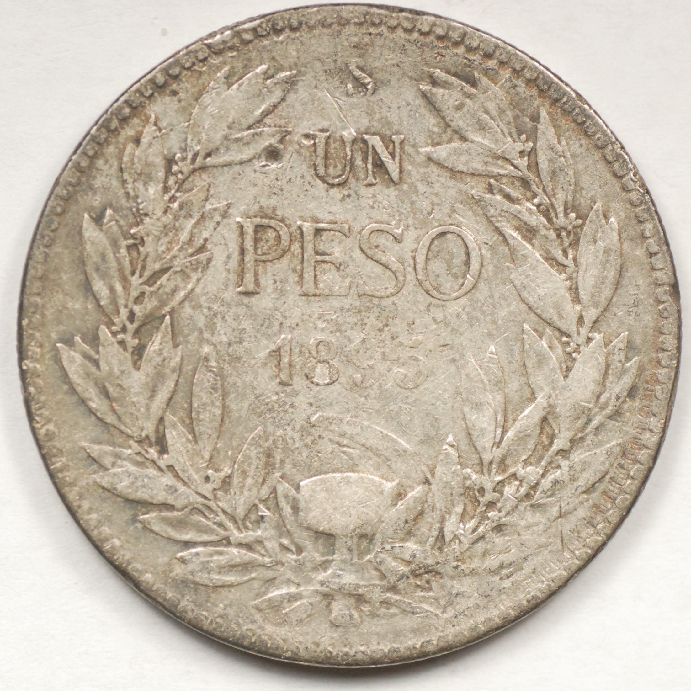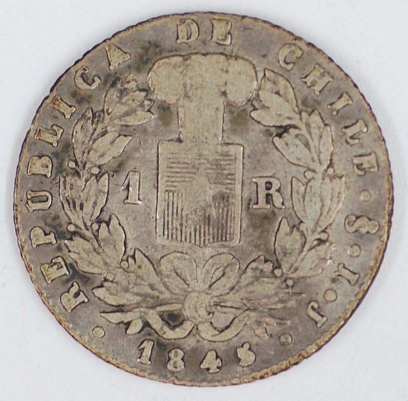 | FC | 22422 | 1845-IJ | CHILE | 1 Real | National Arms | Condor Breaking Chain | 0.900 | 0.0807 | Silver | 94.2 | Very Fine | $20.00 | ||
