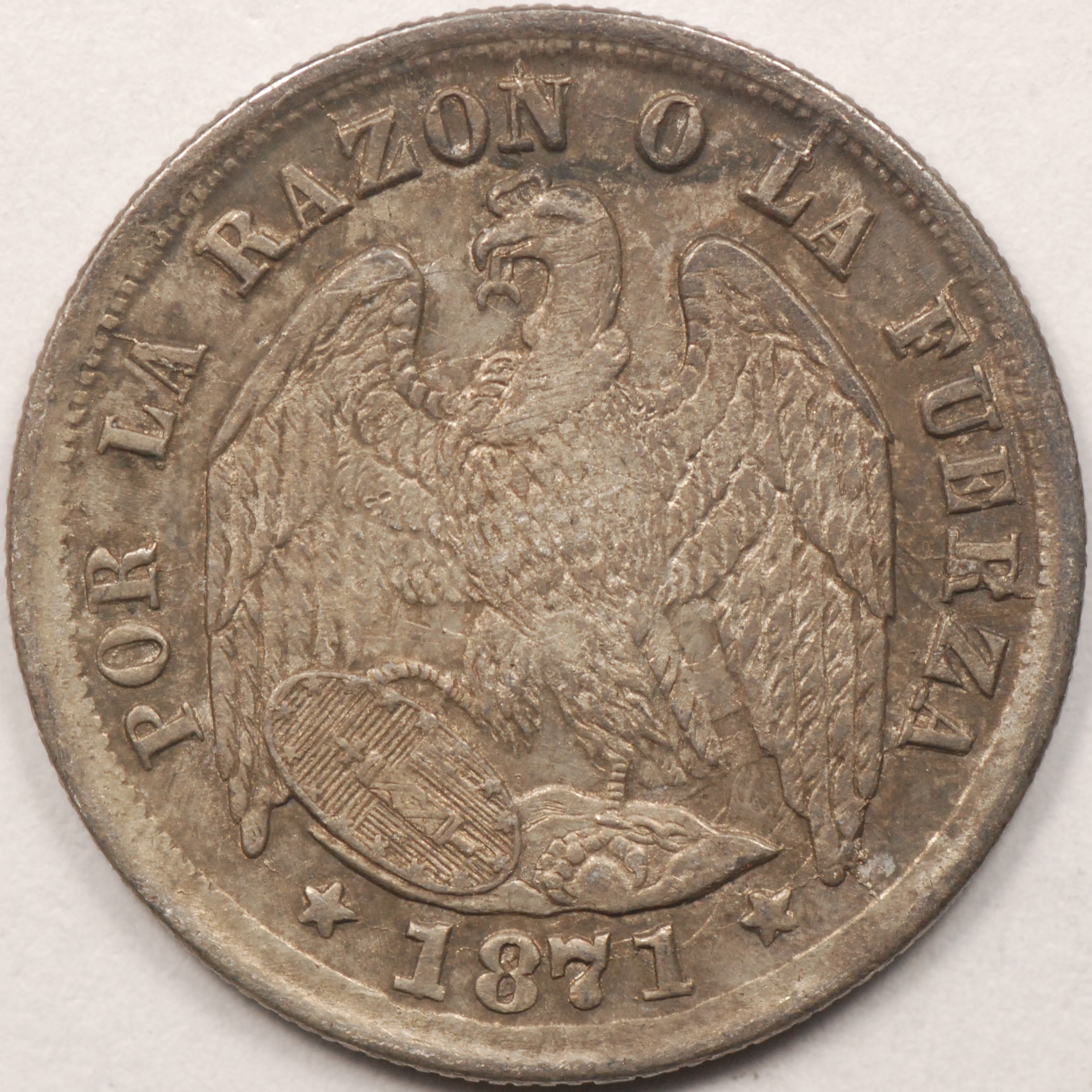 | FC | 28906 | 1867 | CHILE | 20 Centavos | Condor with Wings Spread | Plumed Arms | 0.900 | 0.1331 | Silver | 135 | Very Fine | $25.00 | ||