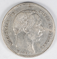 FC | 17599 S | 1864-HC/RH | DENMARK | 2 Rigsdaler | Christian IX | 0.875 | 0.8128 | Silver | 772.1 | Extremely Fine | $1,000.00 | |