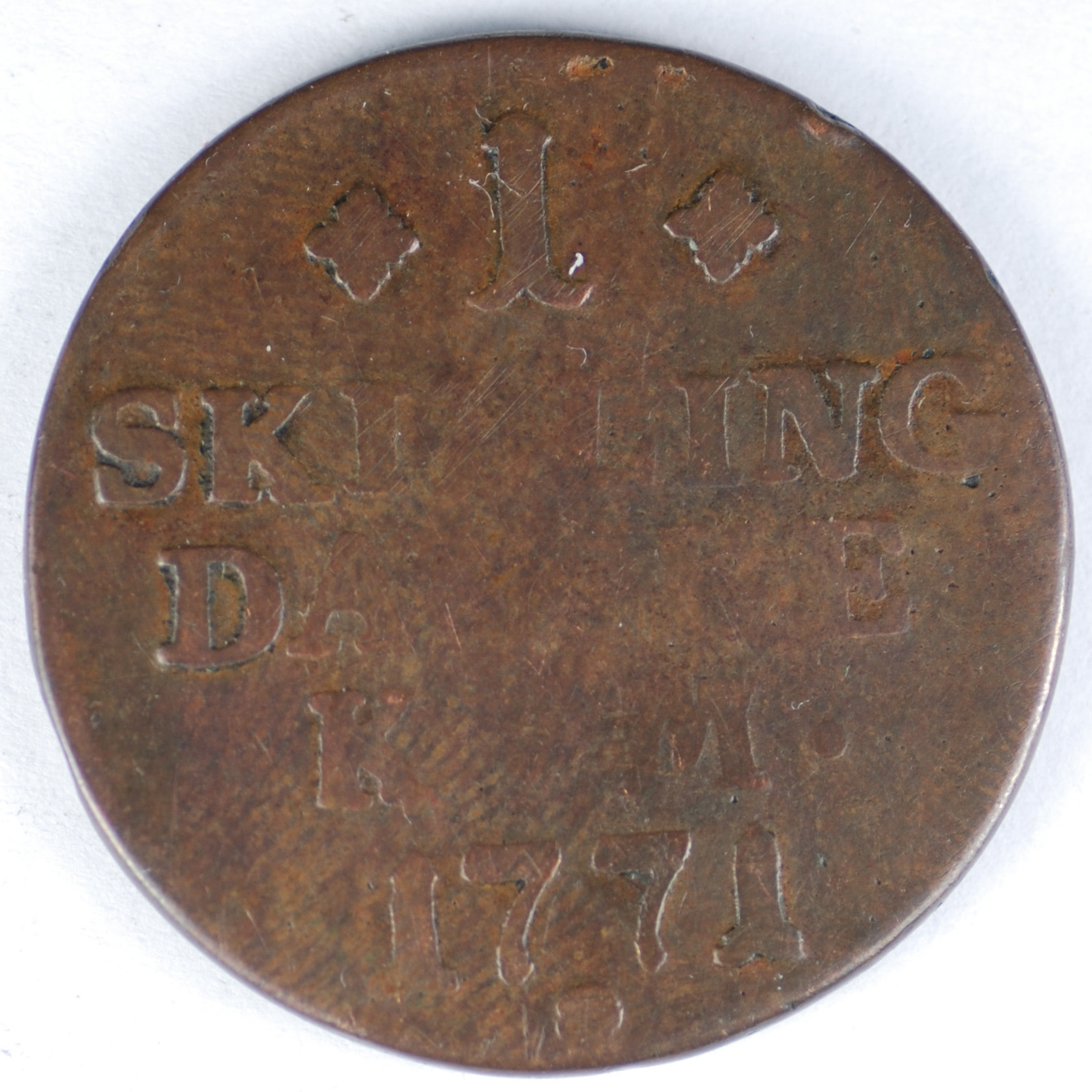 | FC | 26305 | 1771 | DENMARK | 1 Skilling | Crowned Monogram | Christian VII "DANSKE" |