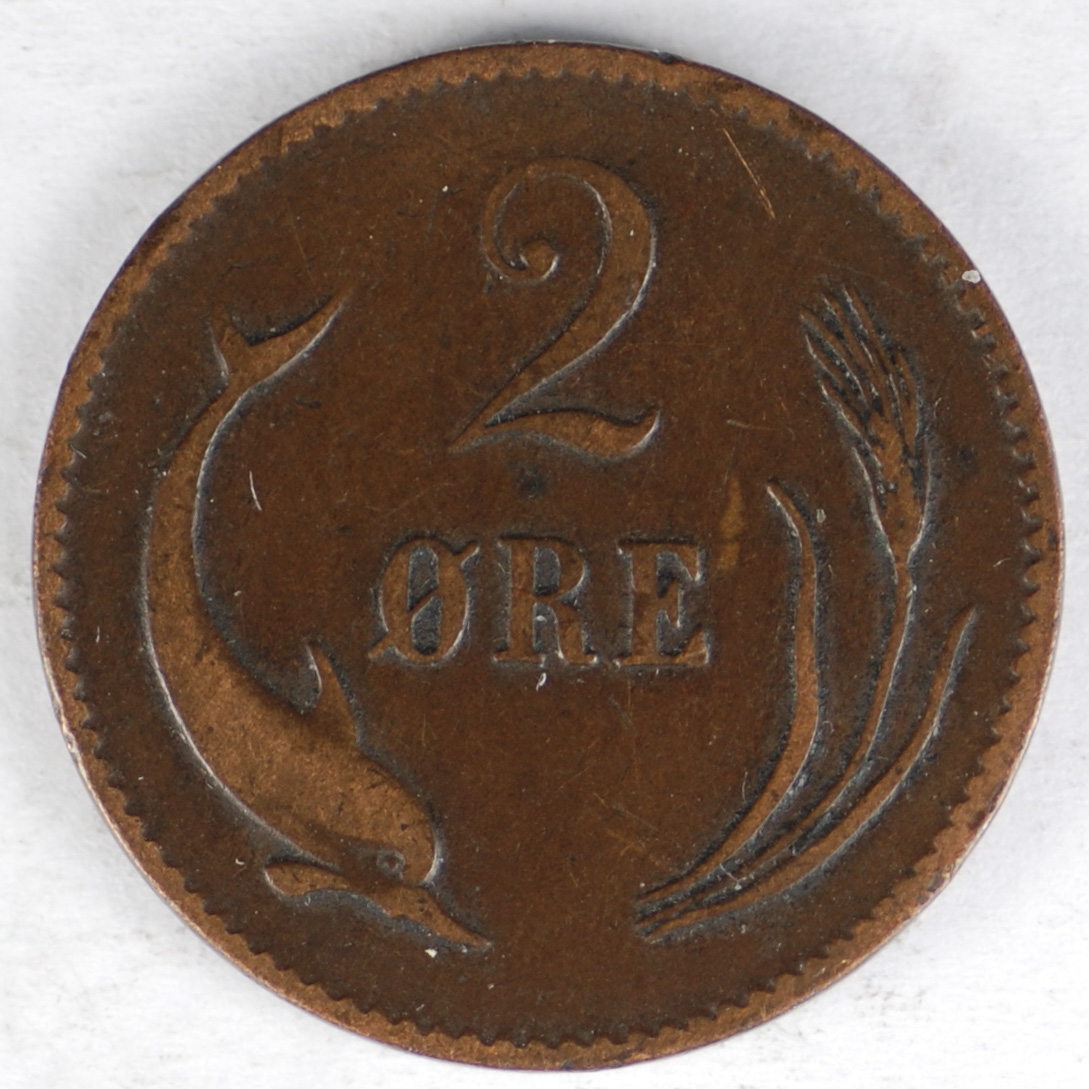 | FC | 36160 | 1874 | DENMARK | 2 Ore | Christian IX | Value above Porpoise and Barley Ear | Bronze | 793.1 | Extremely Fine | $12.50 | ||||