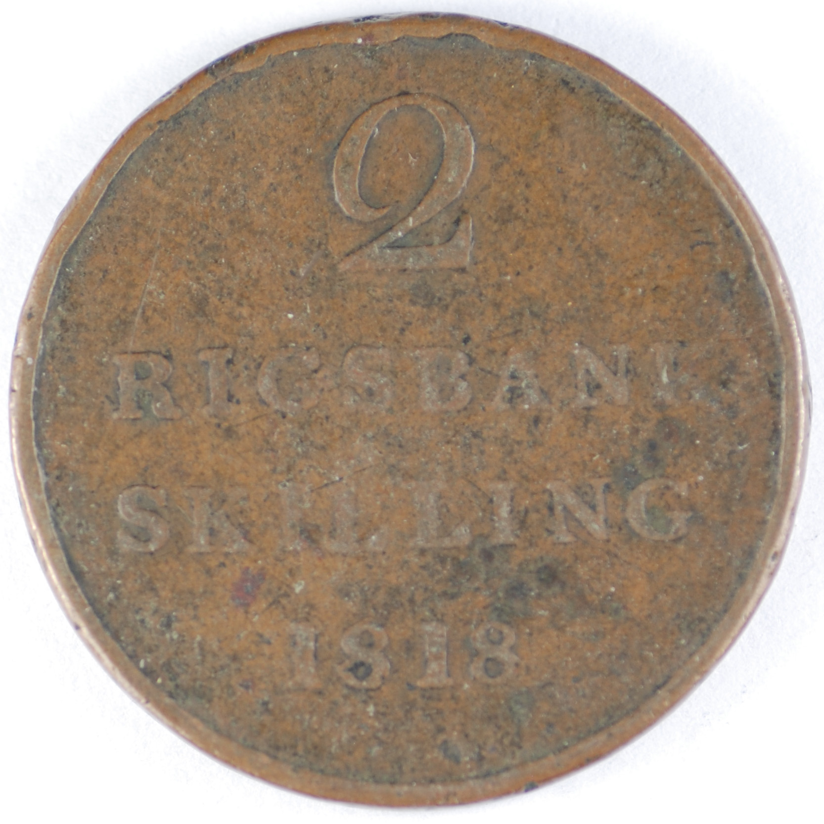 FC | 39074 | 1818 | DENMARK | 2 Rigsbankskilling | Frederick VI | Crowned Oval Arms | Copper | 689 | Very Good | $15.00 | ||