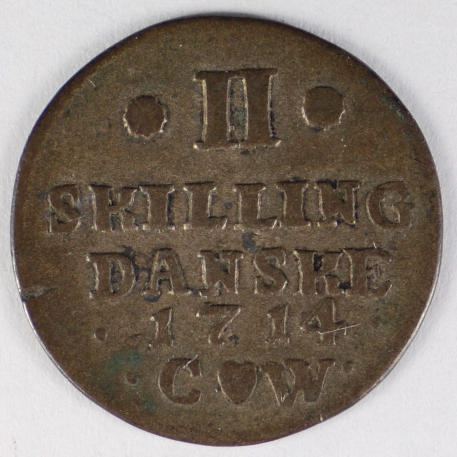 FC | 20124 S | 1714-CW | DENMARK | 2 Skilling | Crowned "4F" Monogram | 0.2813 | 0.0117 | Silver | 502 | Very Fine | $150.00 | |
