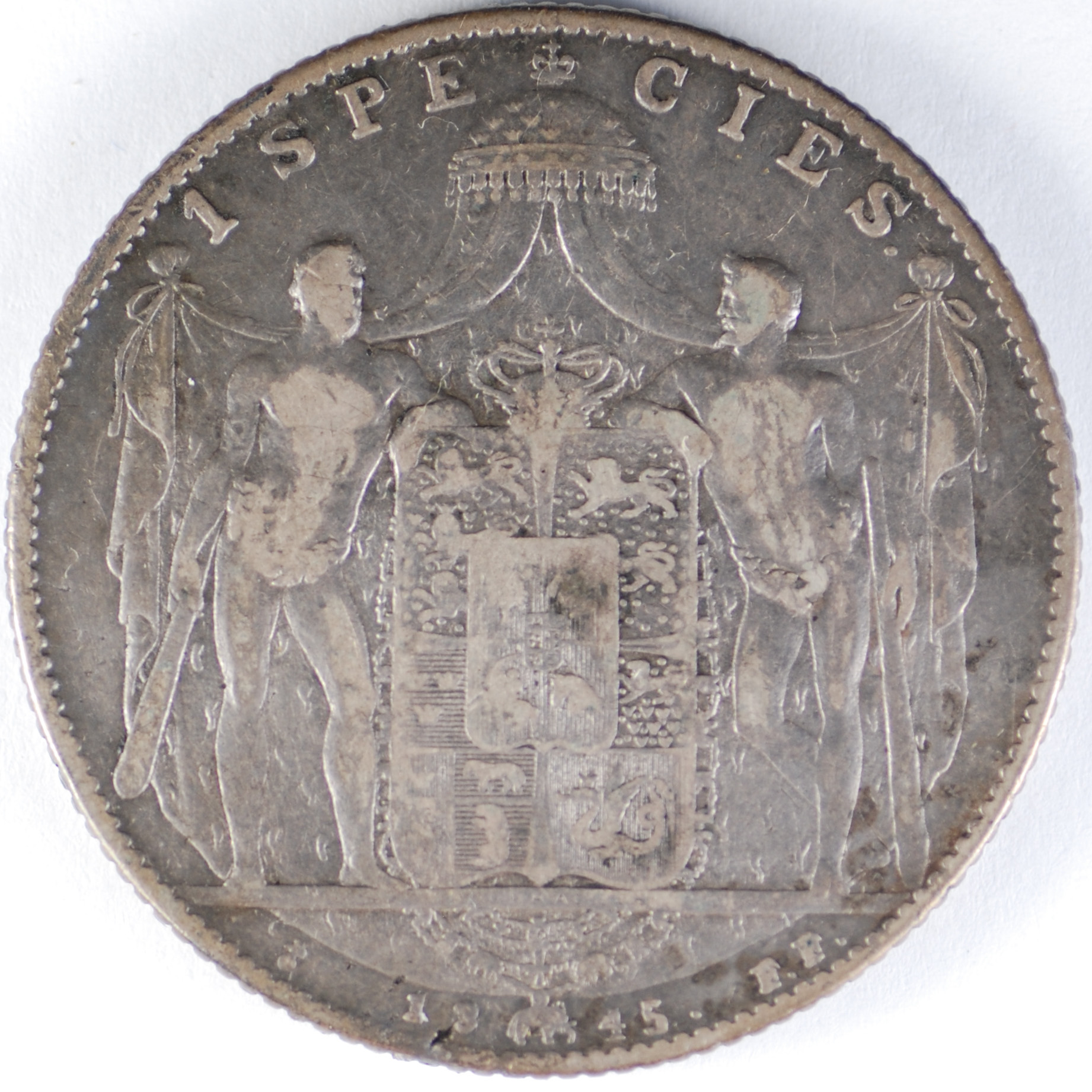 FC | 22431 S | 1845-FF | DENMARK | 1 Speciedaler | Christian VIII | Crowned Arms & Supporters | 0.880 | 0.8128 | Silver | 720.2 | Extremely Fine | $450.00 |