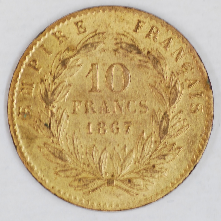 | FC | 16547 | 1867 COPIA | FRANCE | 10 Francs | Napoleon III | 1.9 Gm. 9k COPY | Gold 9 K | About Uncirculated | $55.00 | |||||
