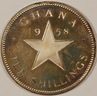 | FC | 6296 | 1958 | GHANA | 10 Shillings | Star | Mintage 11,000 | 0.925 | 0.841 | Silver | 7 | Proof | $32.50 | ||
