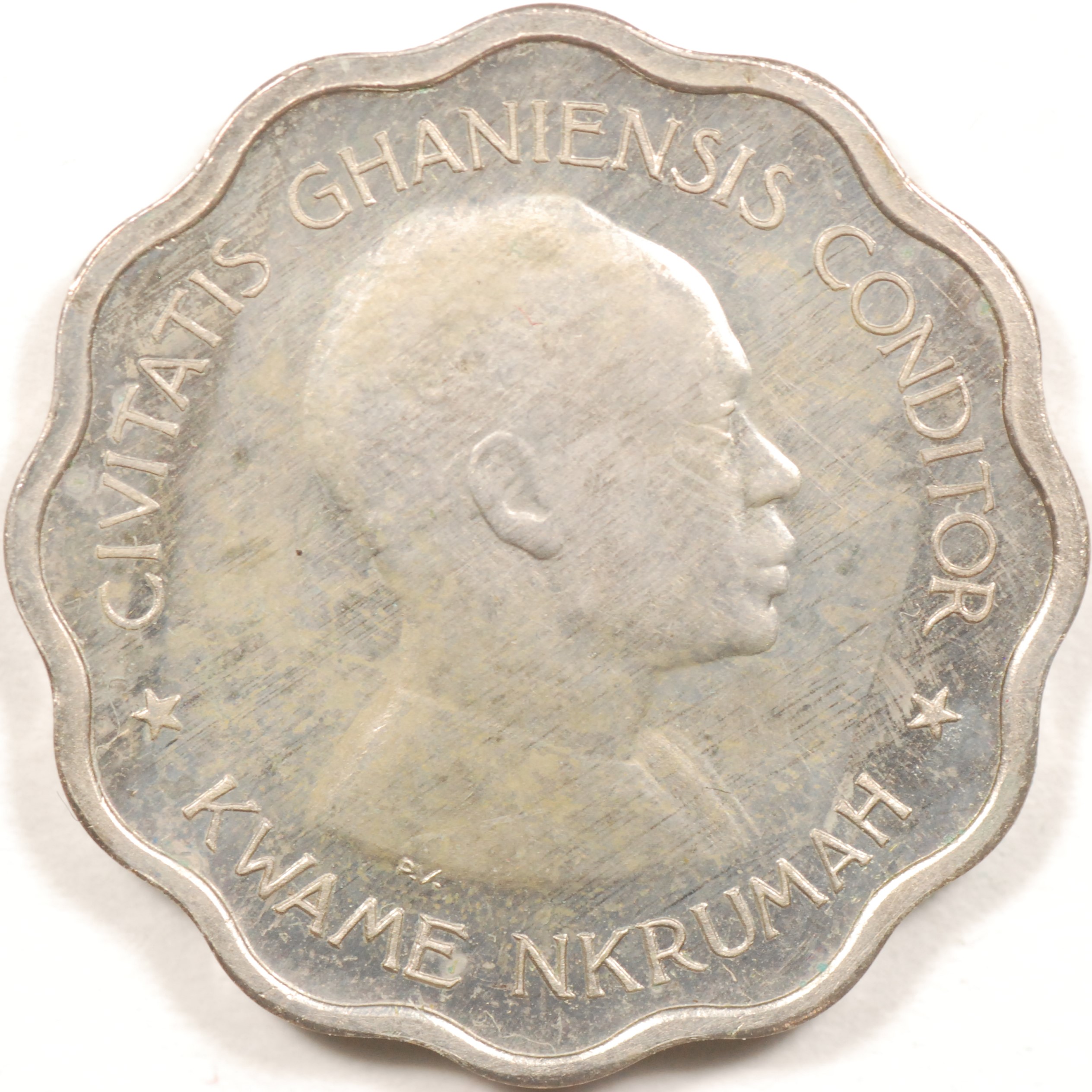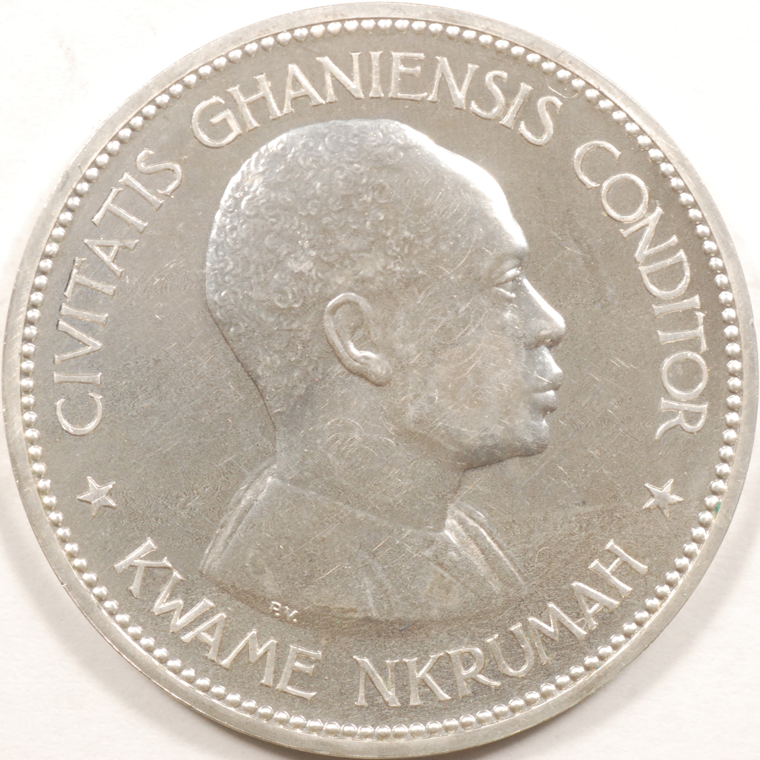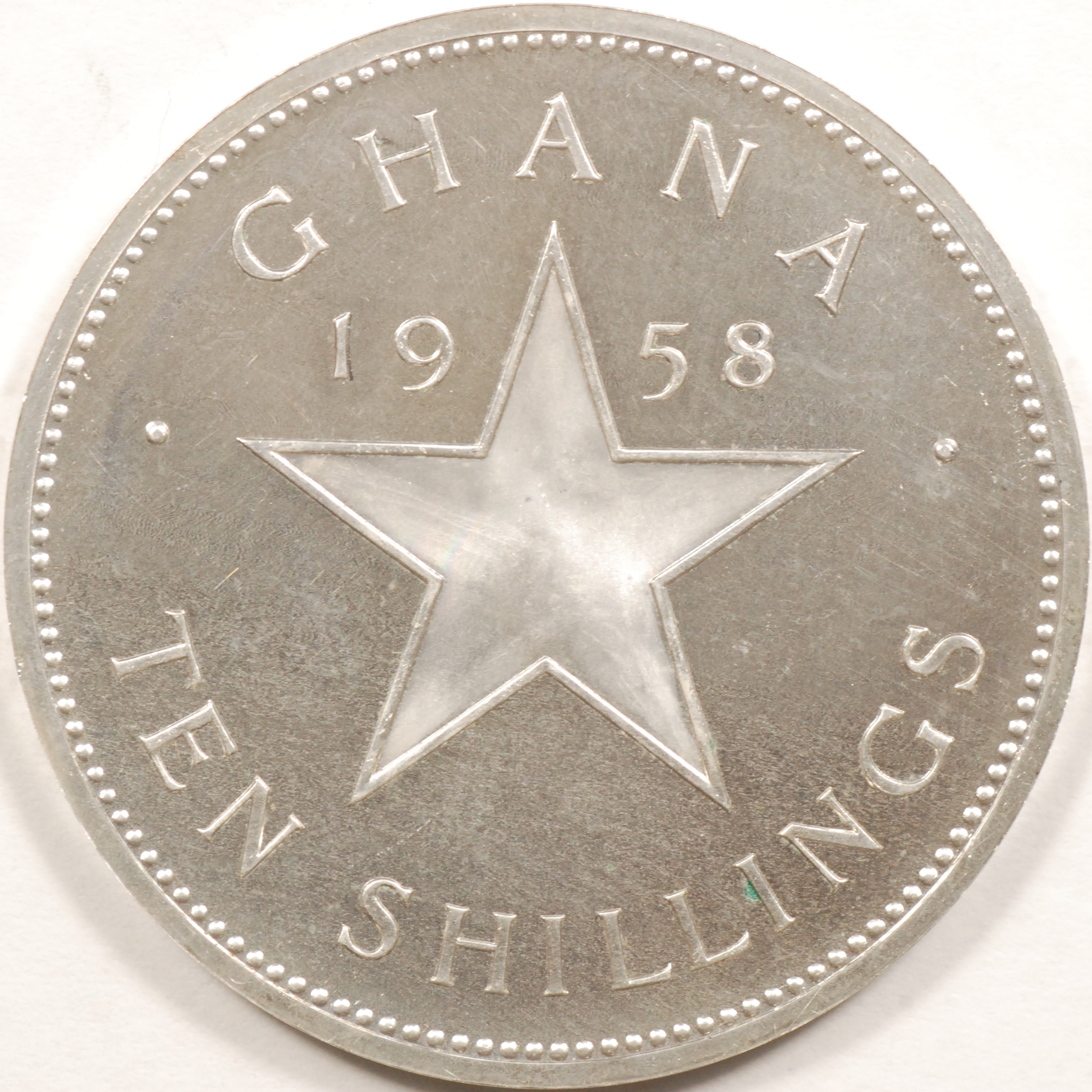 FCS | 32068 | 1958 | GHANA | 10 Shillings | Dr. Kwame Nkrumah | Star, Original Holder | 0.93 | 0.841 | Silver | 7 | Proof | $55.00 |