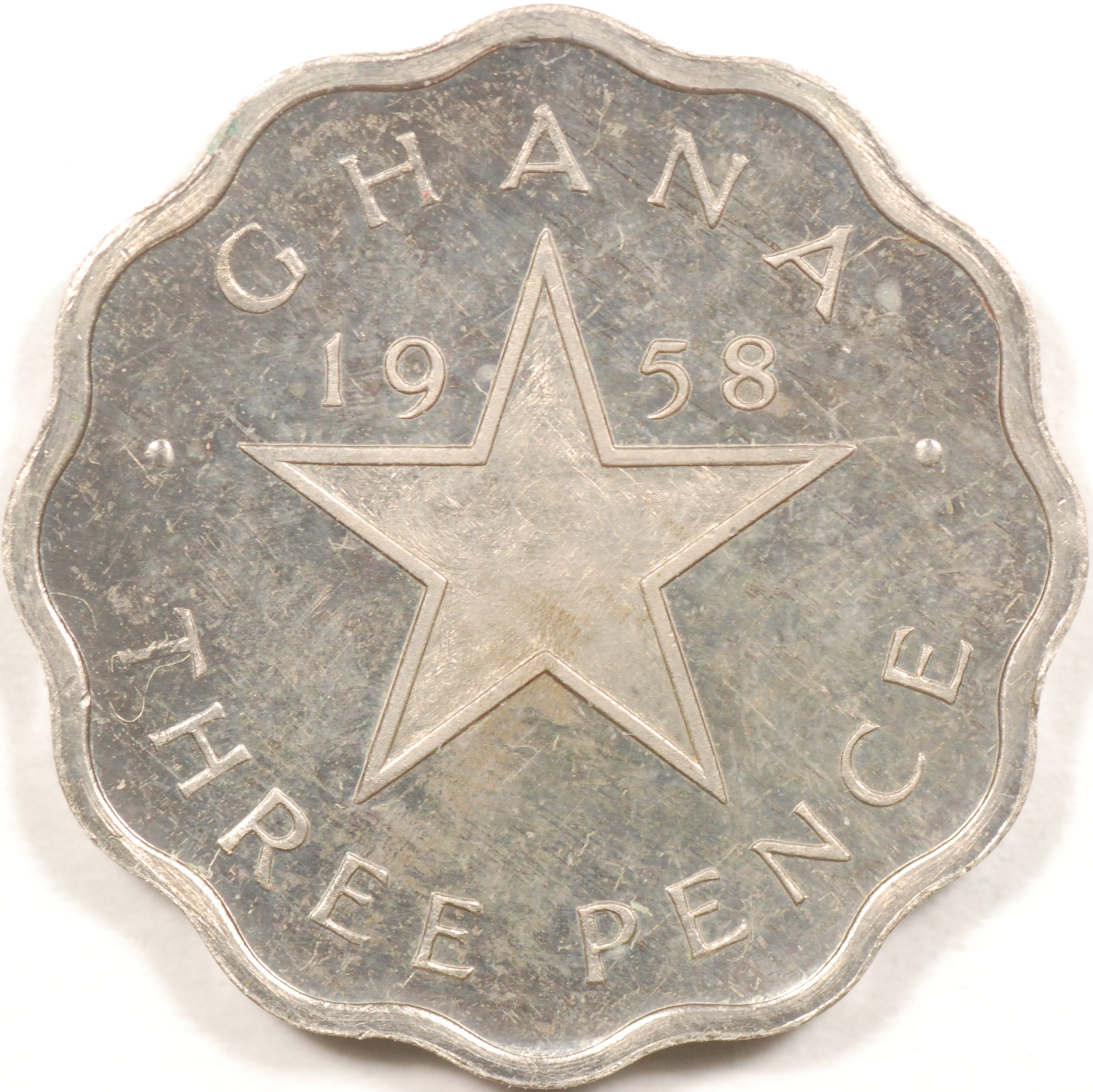 | FC | 6292 | 1958 | GHANA | 3 Pence | Star | Mintage 20,000 | Copper-Nickel | 3 | Proof | $5.00 | ||||