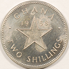 | FC | 6295 | 1958 | GHANA | 2 Shillings | Star | Mintage 20,000 | Copper-Nickel | 6 | Proof | $6.50 | ||||
