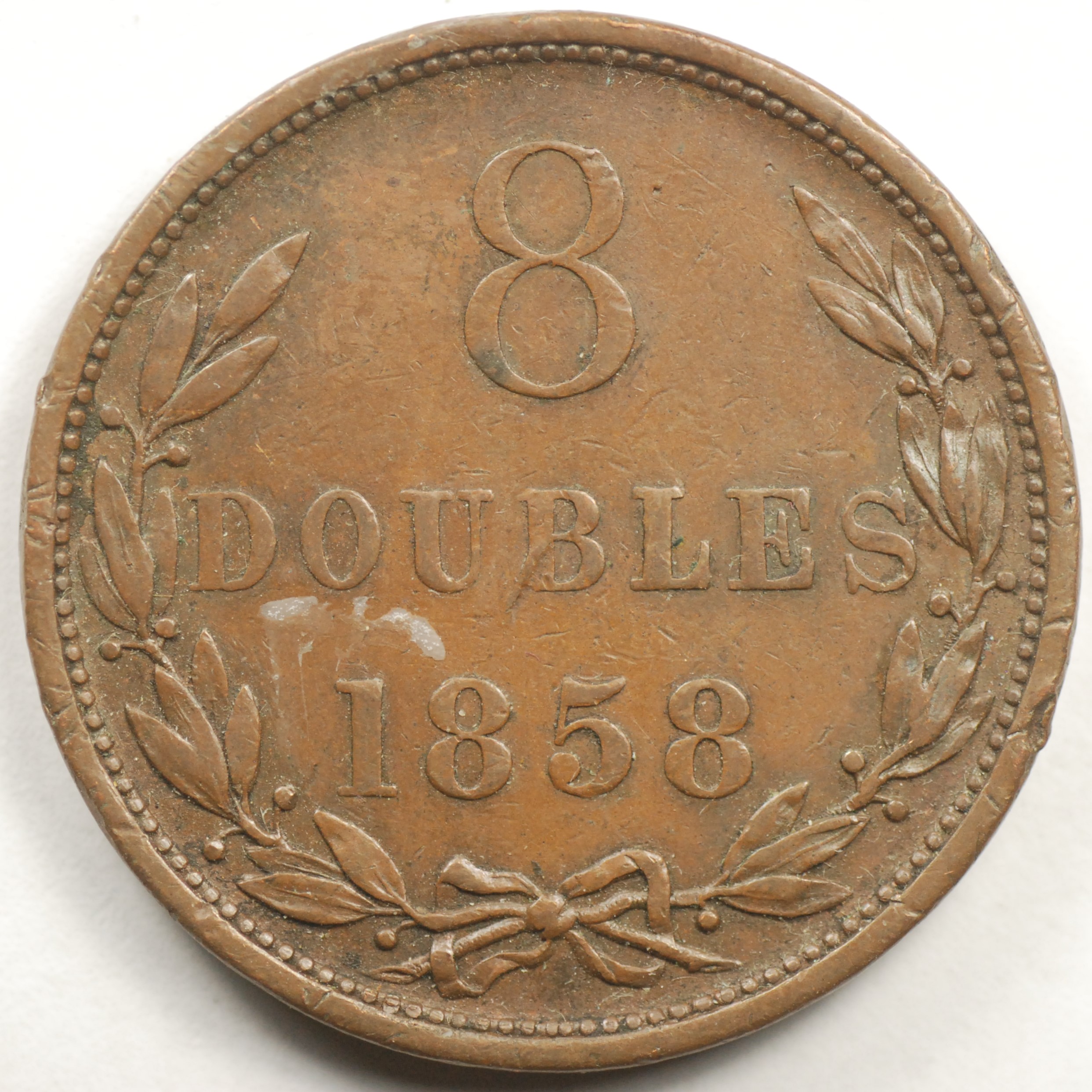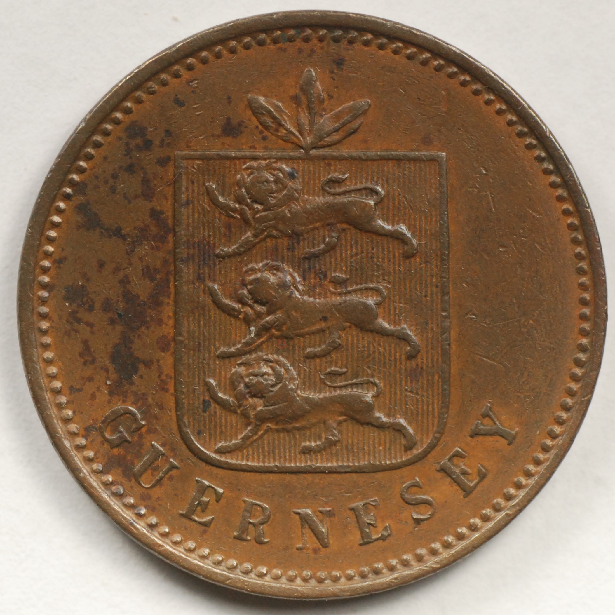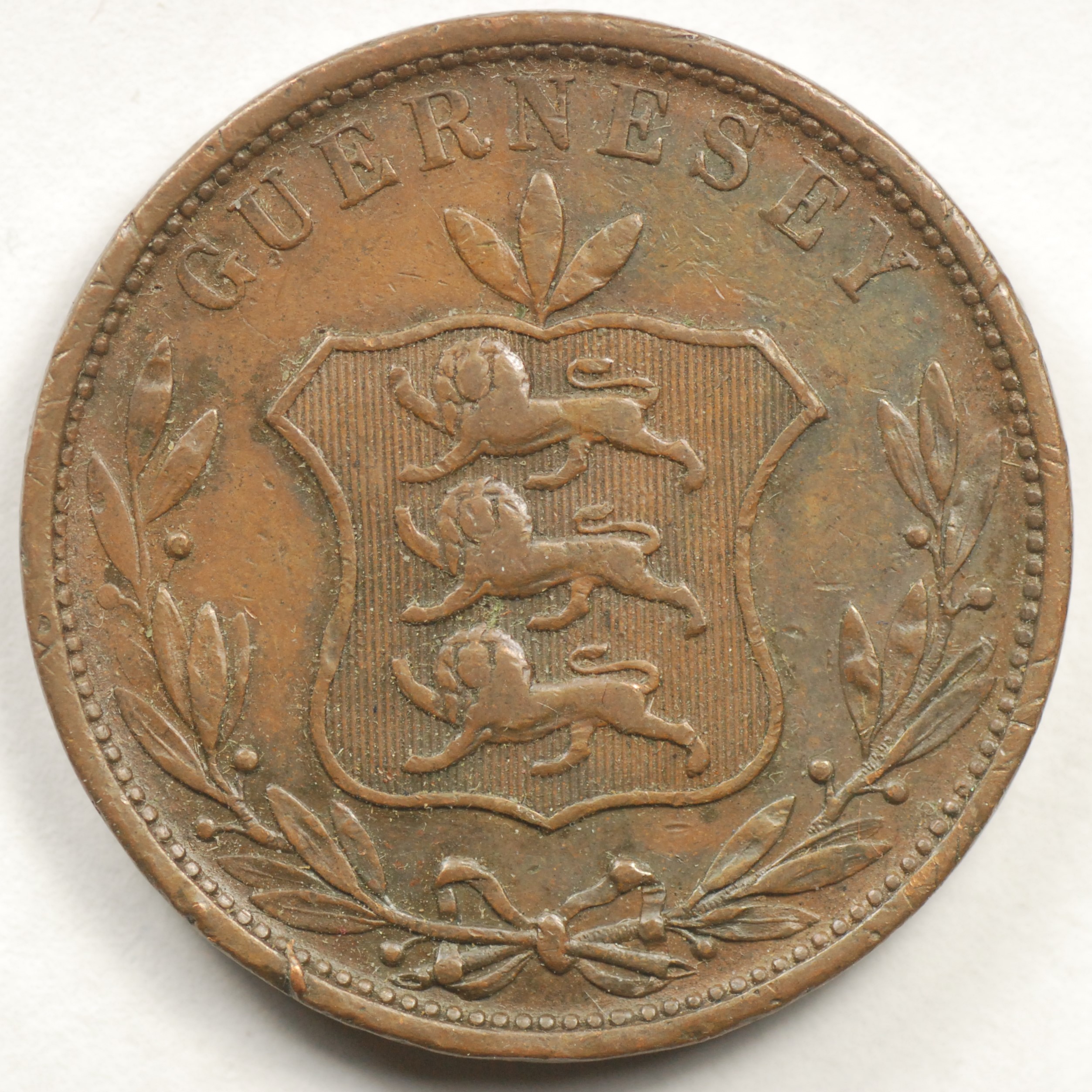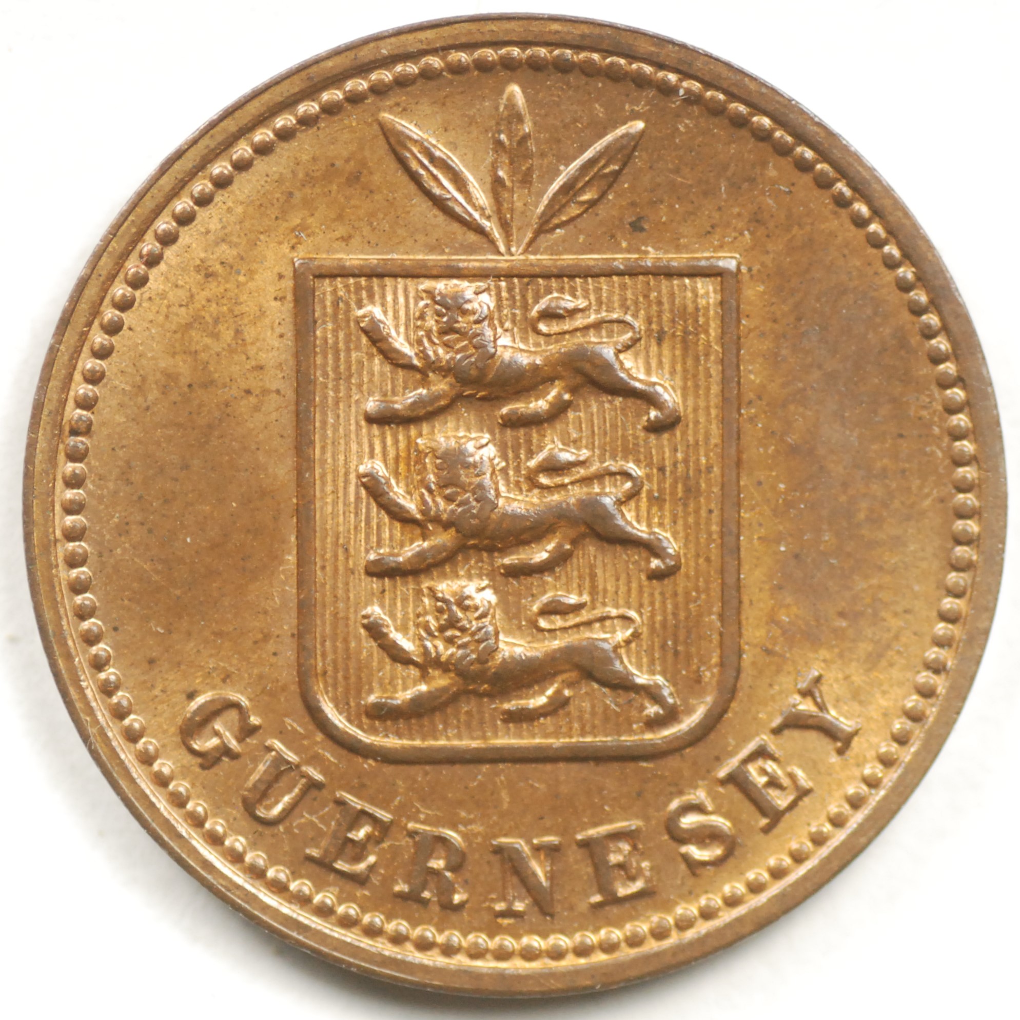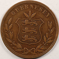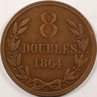 FC | 33394 | 1864 | GUERNSEY | 8 Doubles | National Arms | Value/Date Within Wreath | Bronze | 7 | Extremely Fine | 50.00 | ||||