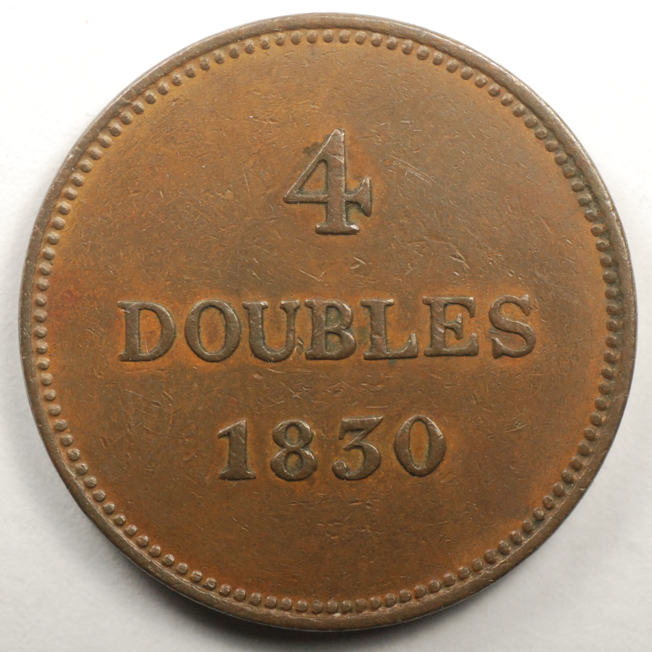 | FC | 8515 | 1830 | GUERNSEY | 4 Doubles | National Arms | Copper | 2 | Extremely Fine | $30.00 | |||||||