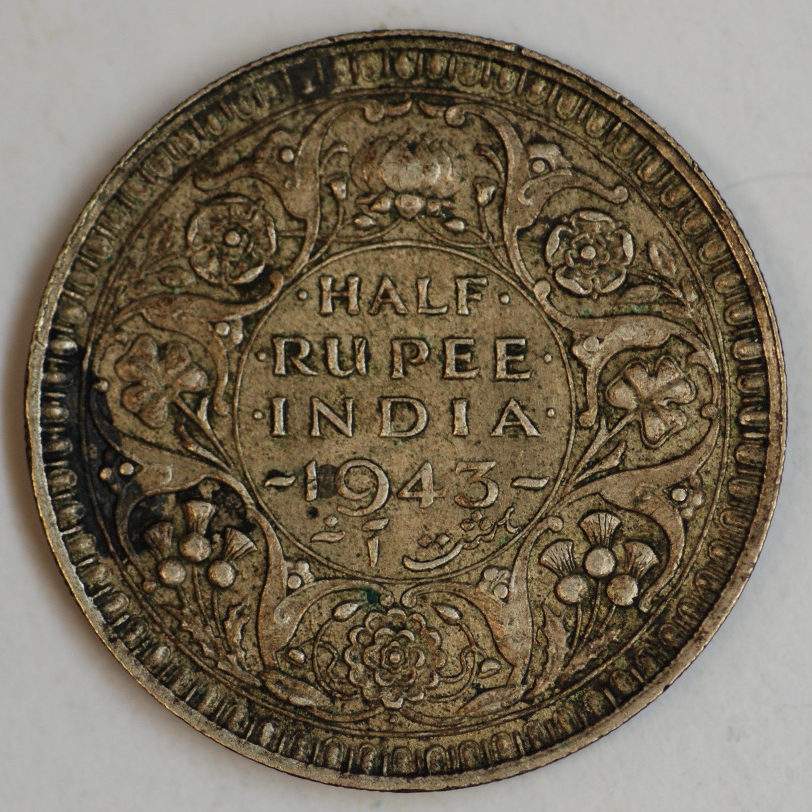 | FC | 19410 | 1943 | INDIA | 1/2 Rupee | George V | Security Edge | 0.917 | 0.1708 | Silver | 552 | Extremely Fine | $12.00 | ||
