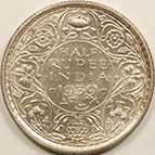 | FC | 19413 | 1944 | INDIA | 1/2 Rupee | George V | Security Edge | 0.917 | 0.1708 | Silver | 552 | Uncirculated | $20.00 | ||