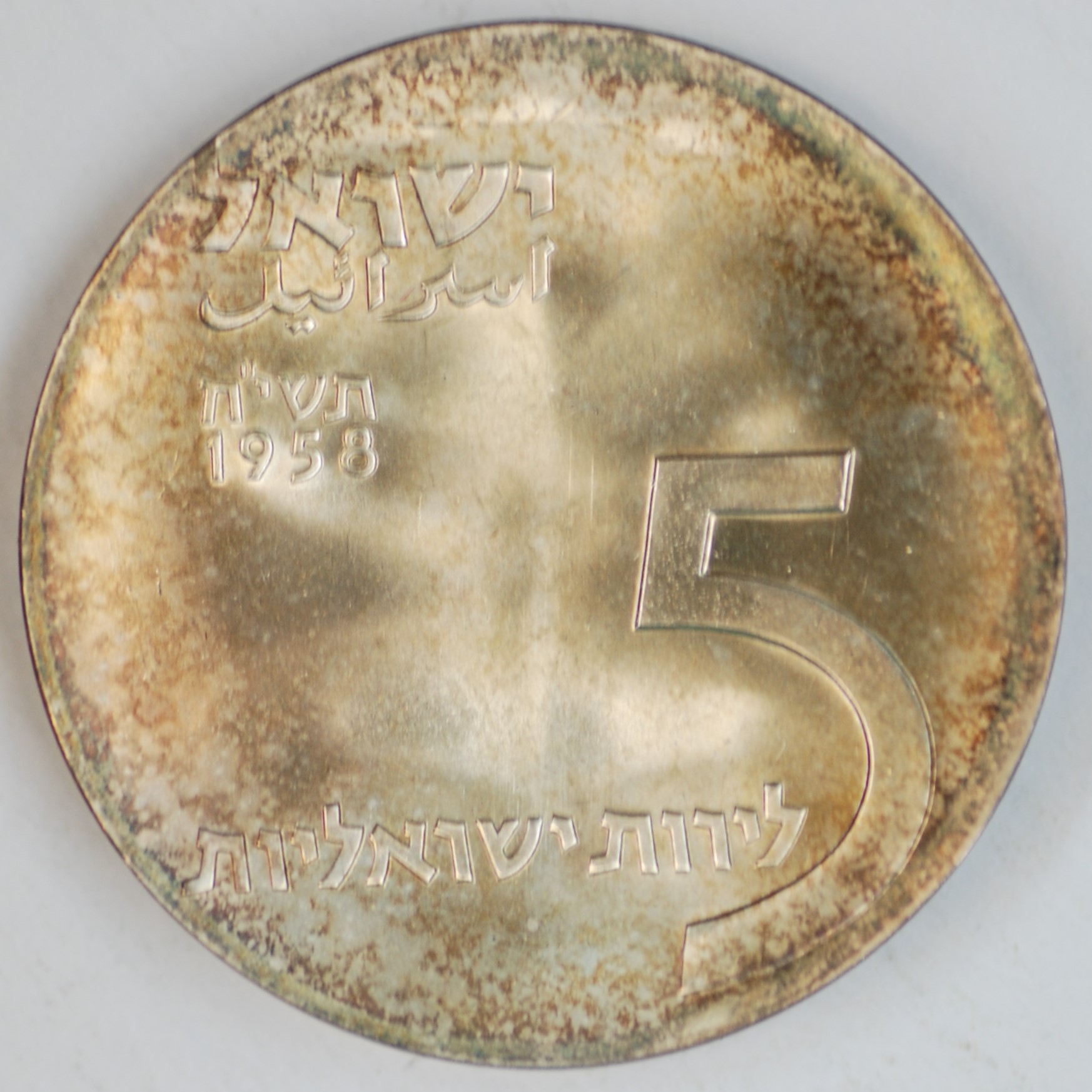 FC | 7155 S | 1958 | ISRAEL | 5 Lirot | KM #21 Menorah, Mintage 2,000 | 0.900 | 0.7234 | Silver | 21 | Proof | $220.00 | |