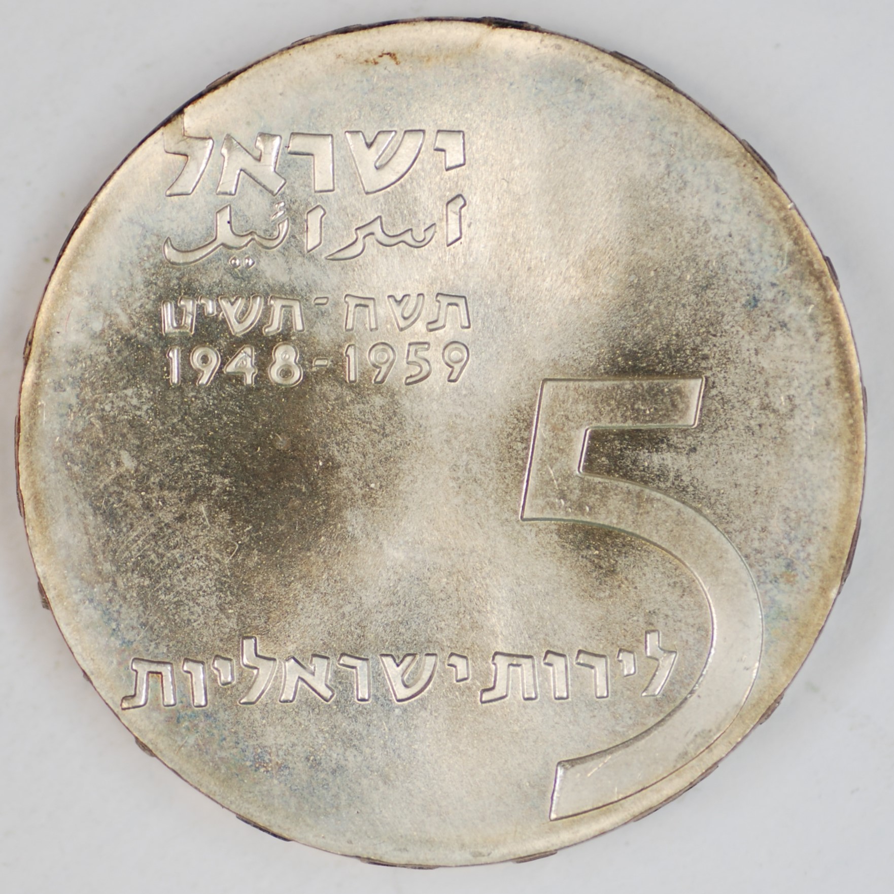 1959 | ISRAEL | 5 Lirot | KM #23 Ingathering of Exiles | 0.900 | 0.7234 | Silver | 23 | Bril. Uncirculated | $36.00 | |||