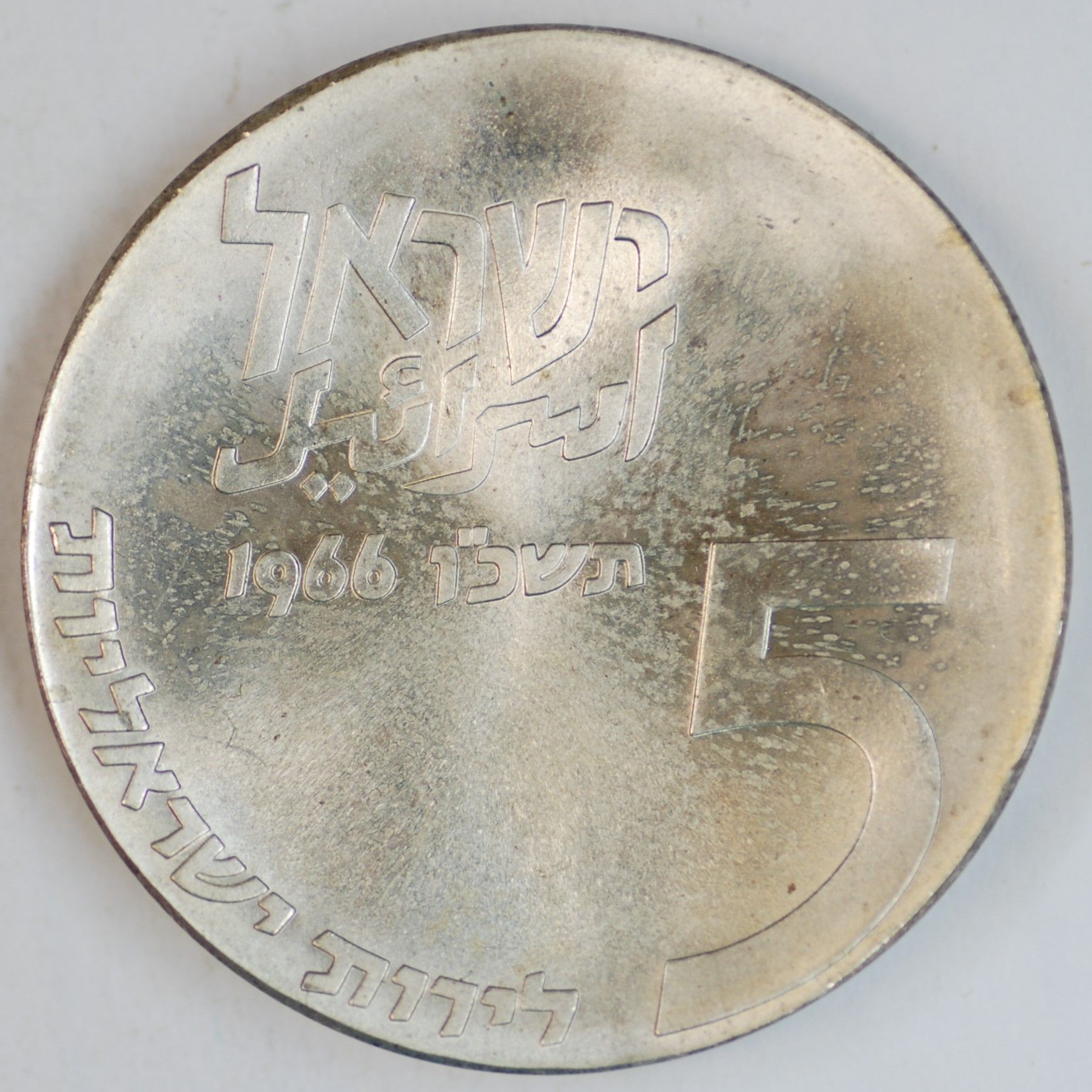 | FC | 7177 | 1965 | ISRAEL | 5 Lirot | KM #45 Knesset Building | 0.900 | 0.7234 | Silver | 45 | Bril. Uncirculated | $40.00 | |||