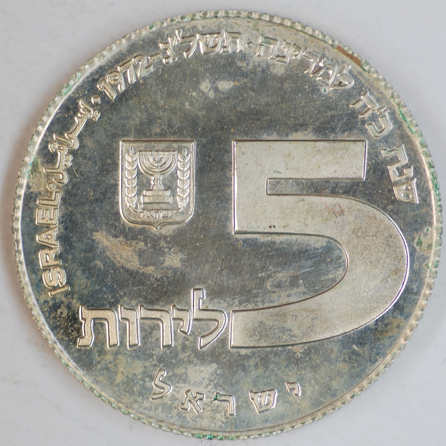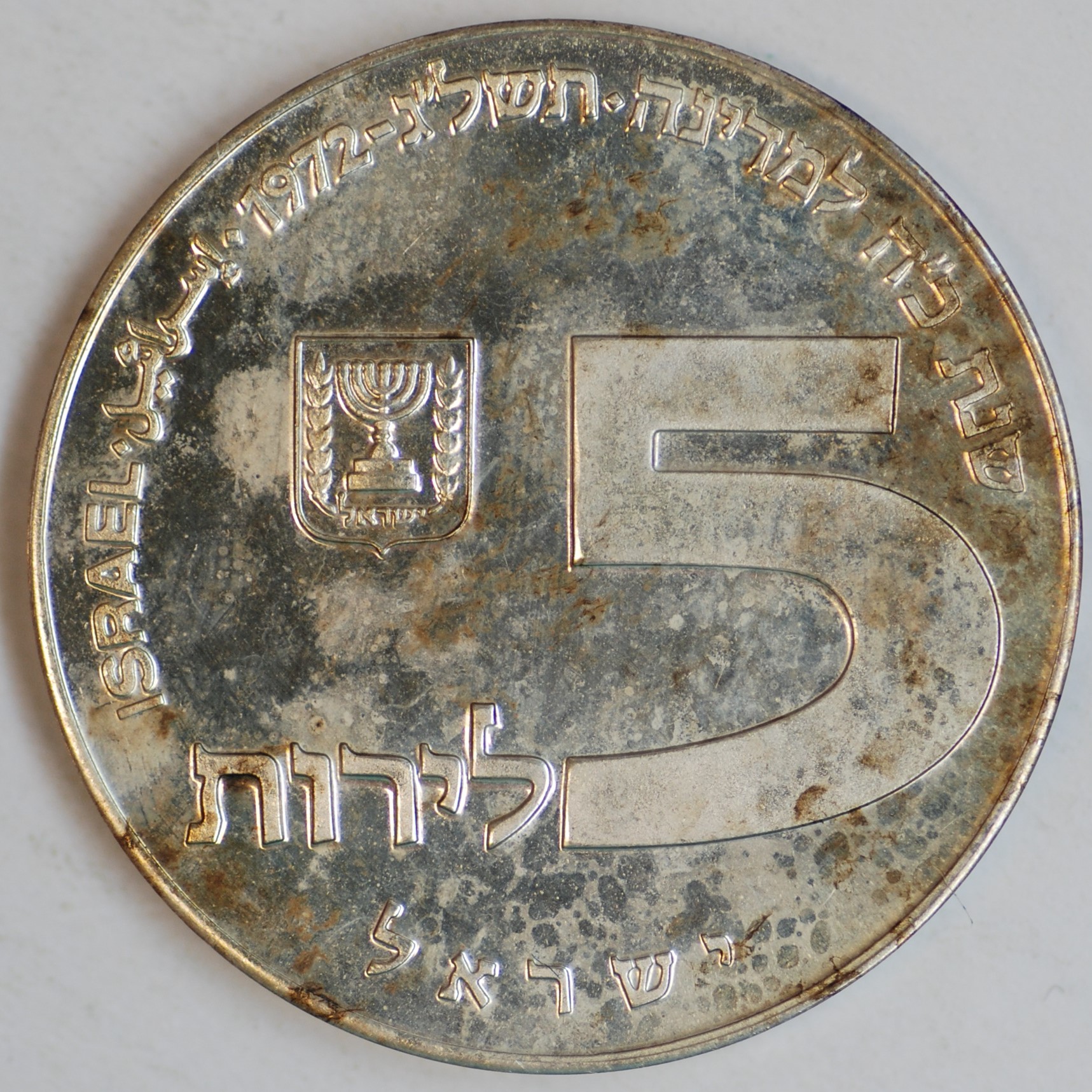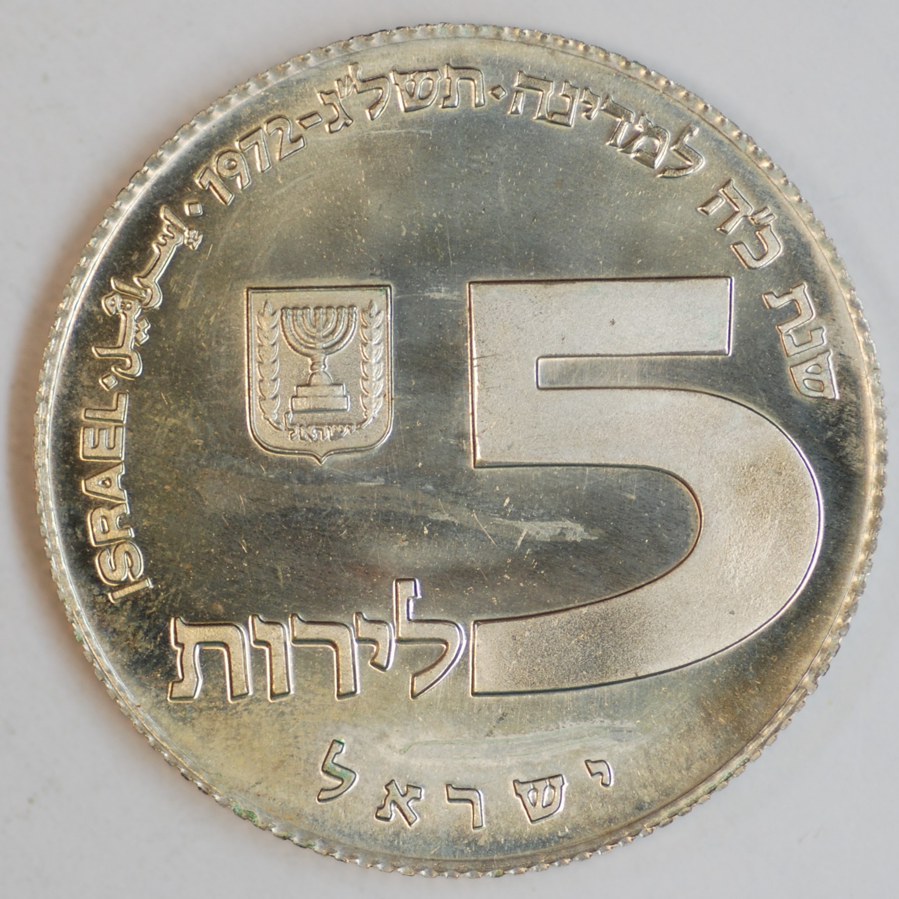 | FC | 7192 | 1972 | ISRAEL | 5 Lirot | KM #69.1 Russian Lamp | 0.900 | 0.4822 | Silver | 69.1 | Bril. Uncirculated | $24.00 | |||
