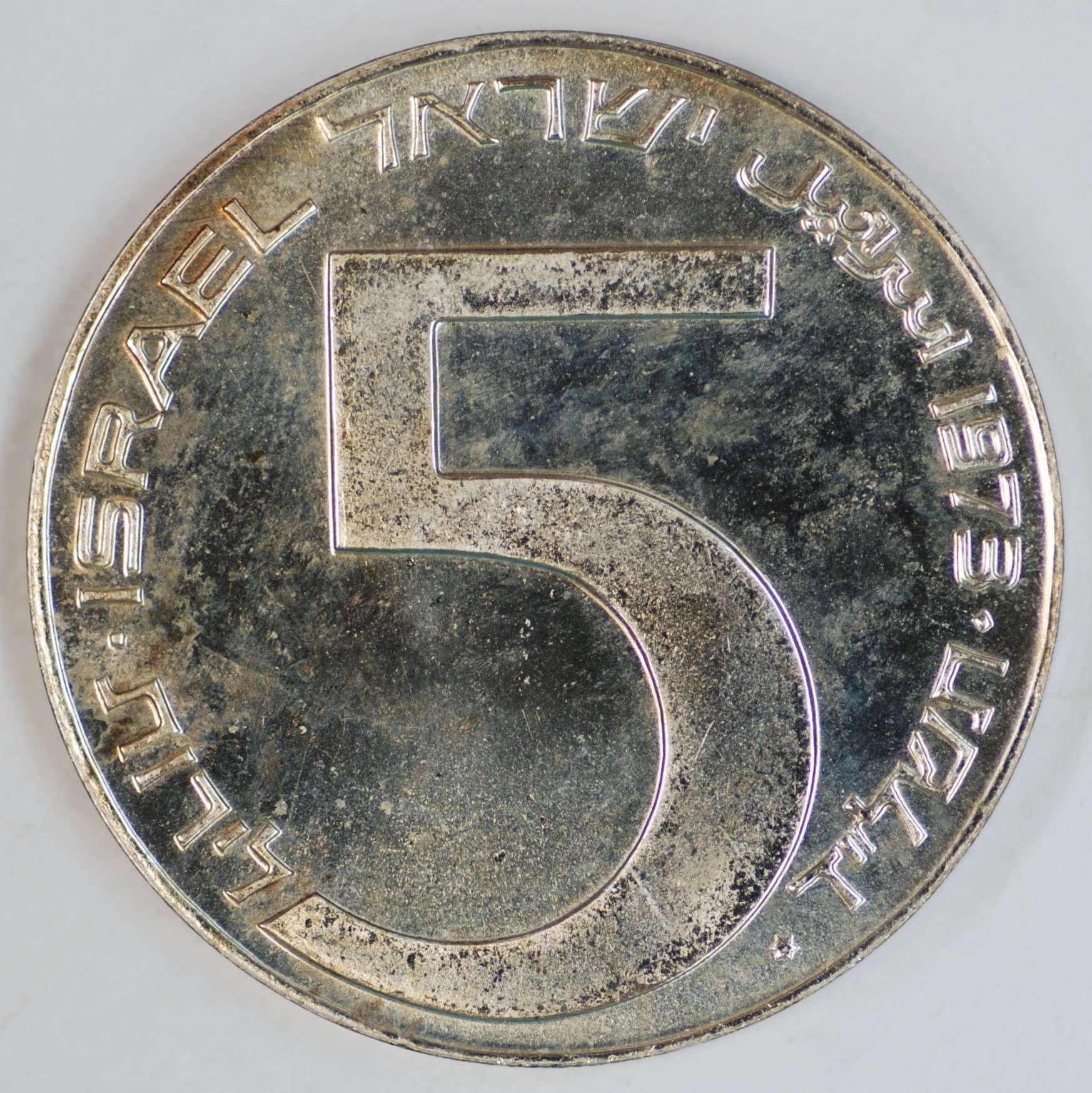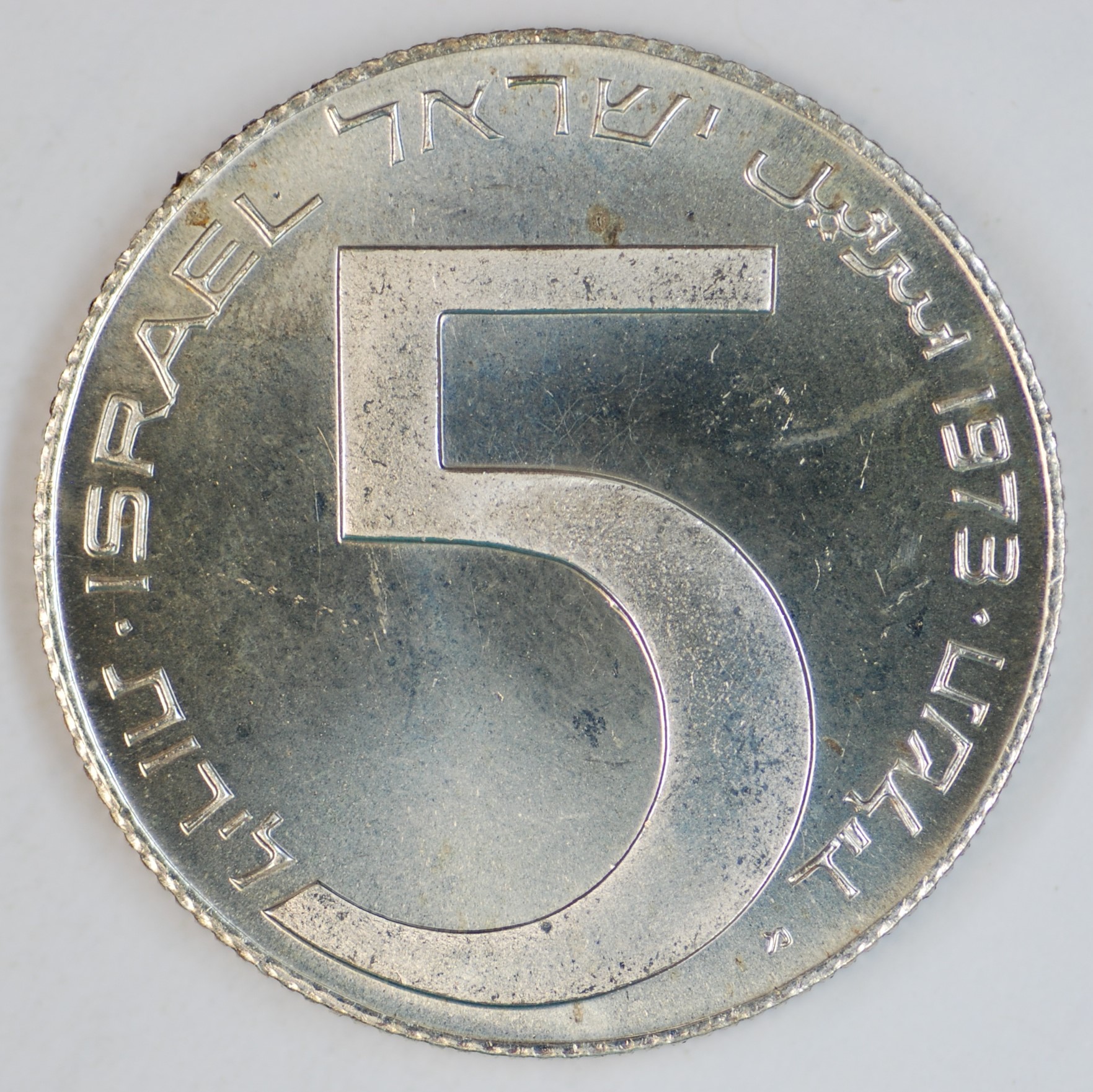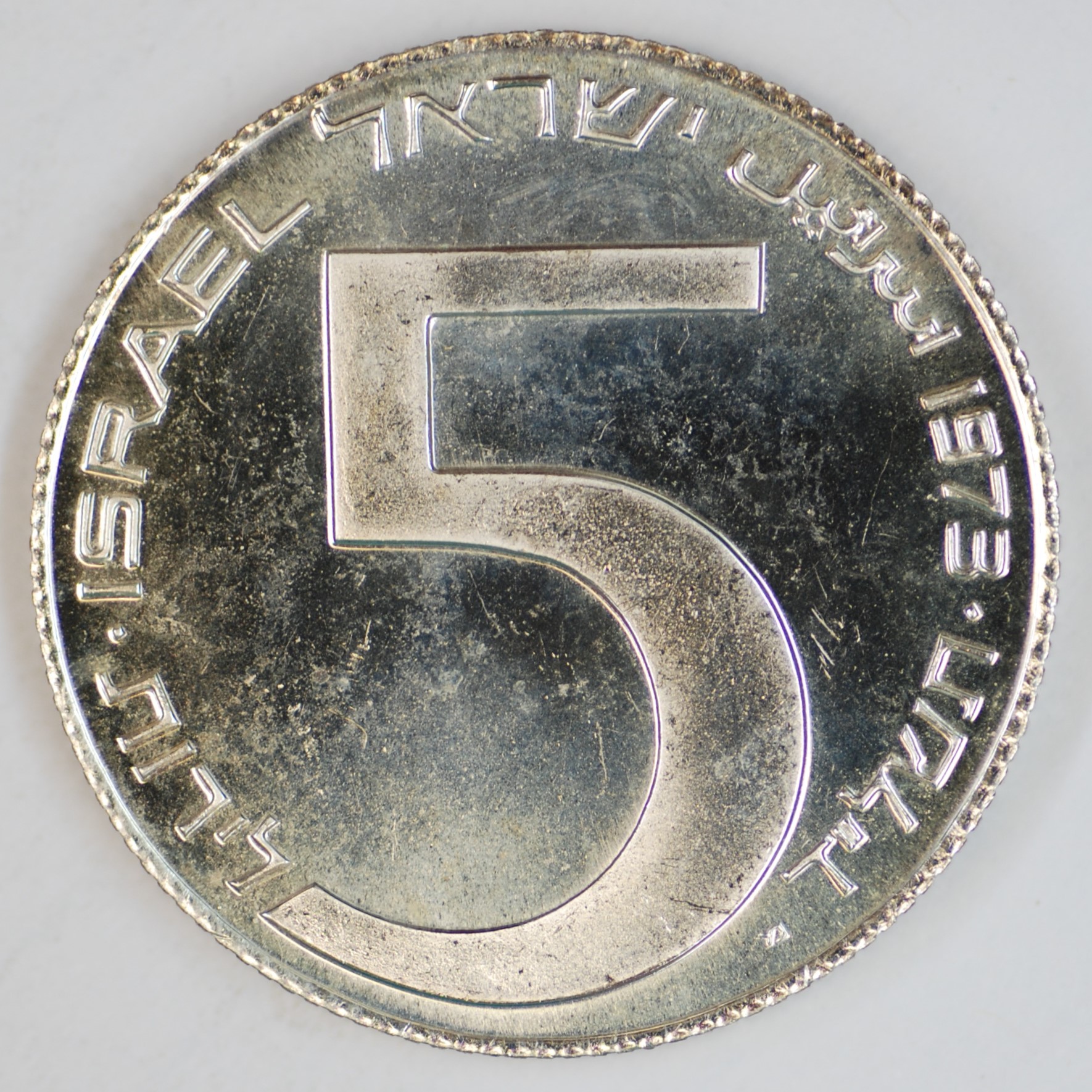 | FC | 7193 | 1973 | ISRAEL | 5 Lirot | KM #75.1 Babylonian Lamp | 0.500 | 0.3215 | Silver | 75.1 | Bril. Uncirculated | $16.00 | |||