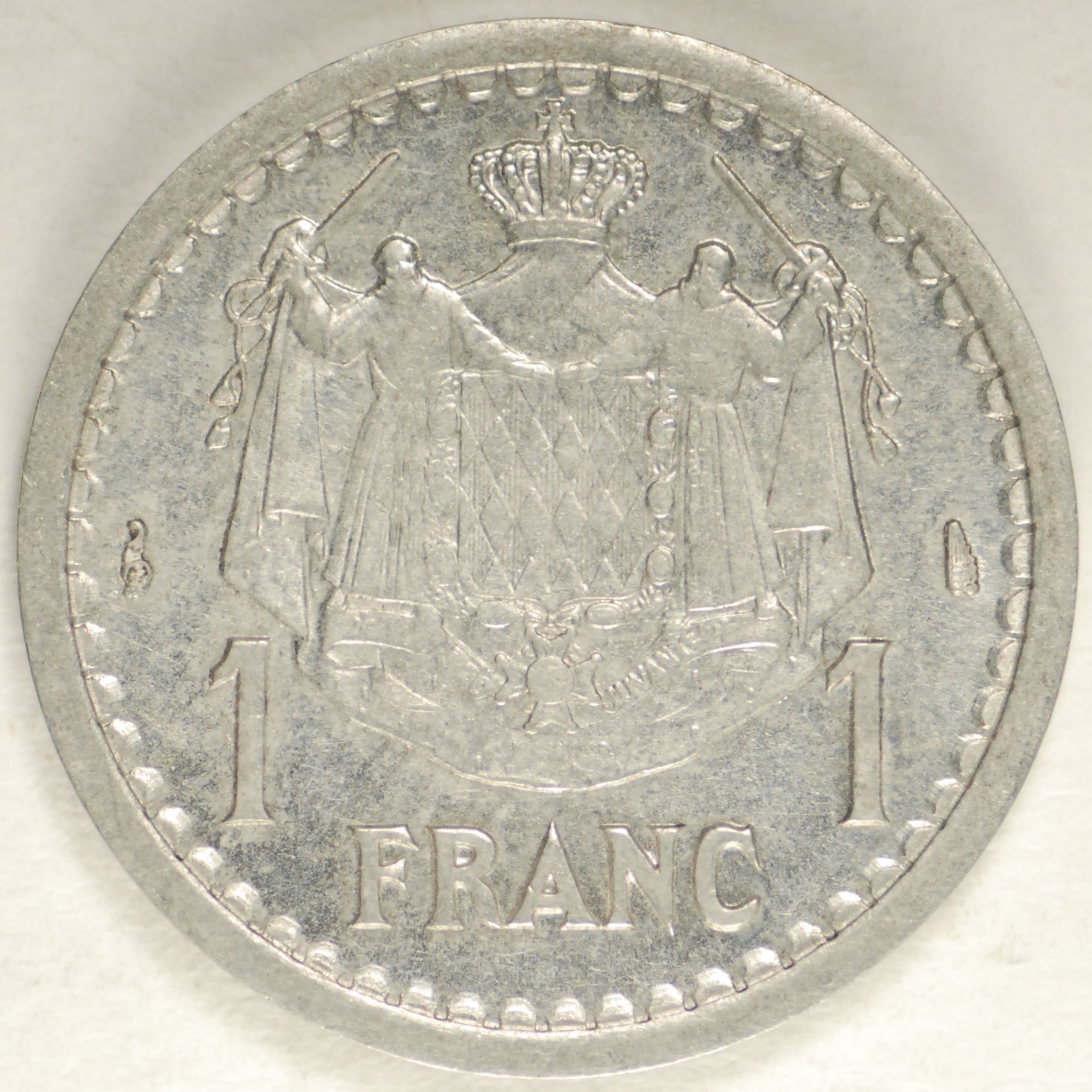 | FC | 18471 | 1945 (ND) | MONACO | 1 Franc | Crowned Mantled Arms | Louis II | Aluminum-Bronze | 120a | Uncirculated | $8.00 | ||||
