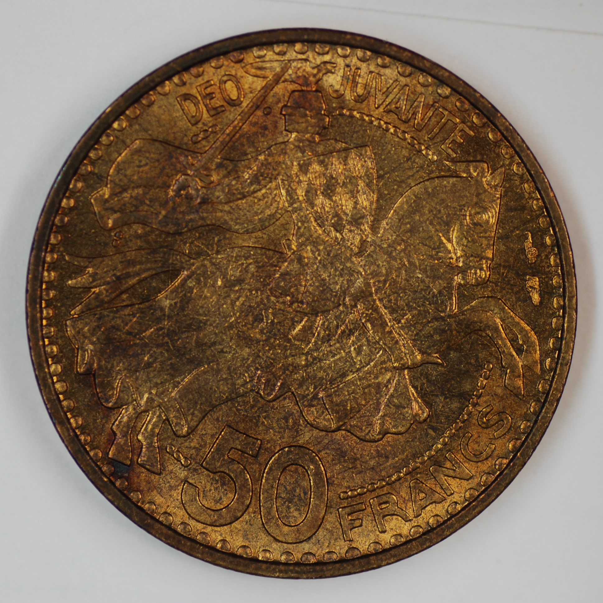 | FC | 50077 | 1950 | MONACO | 50 Francs | Rainier III | Armored Equestrian | Aluminum-Bronze | 132 | Extremely Fine | $5.00 | ||||
