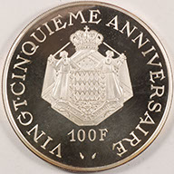 | FC | 33108 S | 1974 | MONACO | 100 Francs | 25th Anniv. Reign | Coat of Arms | 1.00 | 1.896 | Silver | Proof | $200.00 | |||