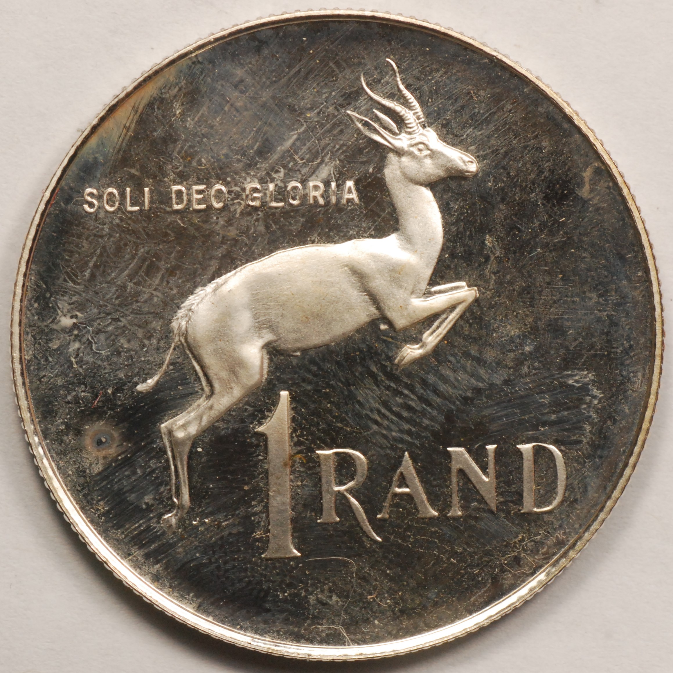 FC | 39171 | 1965 | SOUTH AFRICA | 1 Rand | Springbok | Jan van Riebeeck | 0.800 | 0.3858 | Silver | 71.1 | Proof | $25.00 |
