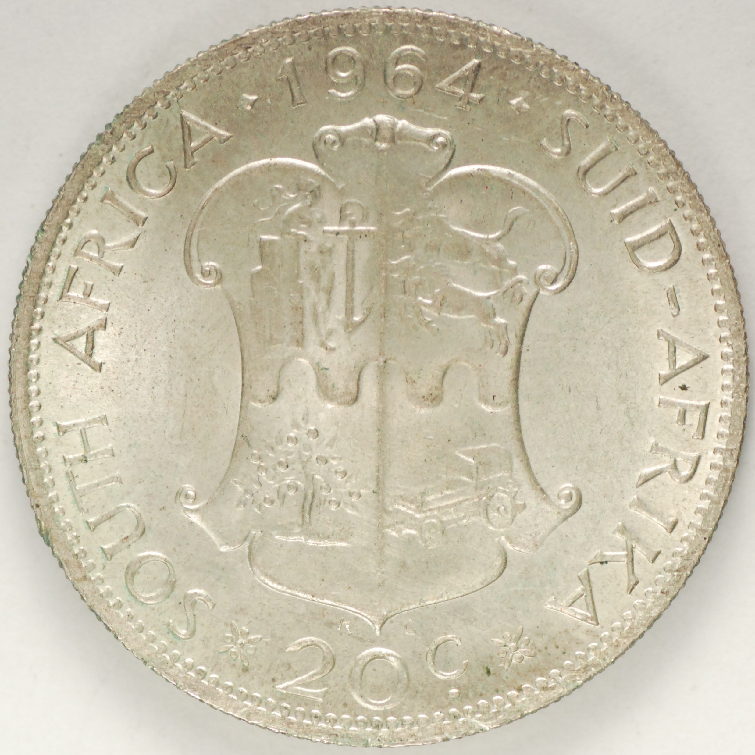 | FC | 25718 | 1964 | SOUTH AFRICA | 20 Cents | Jan van Reibeeck | 0.500 | 0.1818 | Silver | 61 | Bril. Uncirculated | $7.50 | ||||