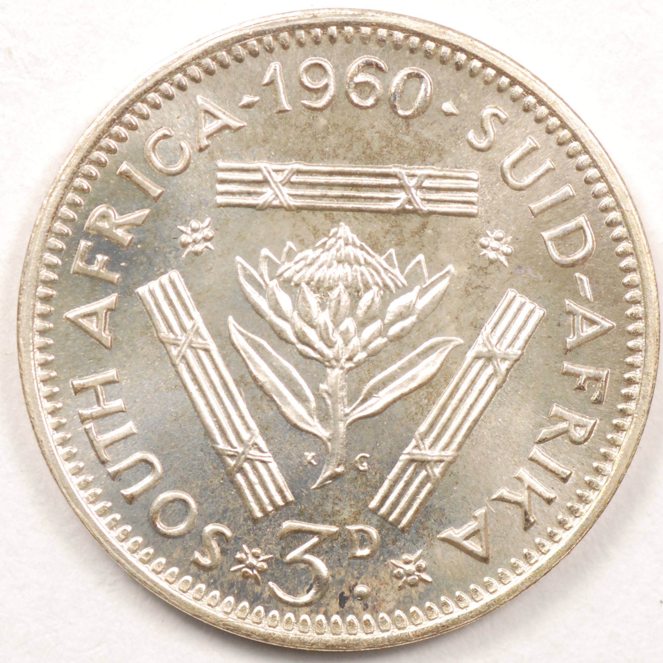 | FC | 19798 | 1960 | SOUTH AFRICA | 3 Pence | Protea Flower | Elizabeth II | 0.500 | 0.0227 | Silver | 47 | Proof-65 | $10.00 | |||