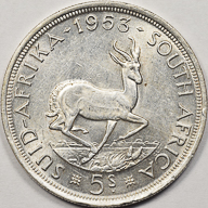1953 | SOUTH AFRICA | 5 Shillings | Springbok | Elizabeth II | 0.500 | 0.4546 | Silver | 52 | Gem Uncirculated | $50.00 |