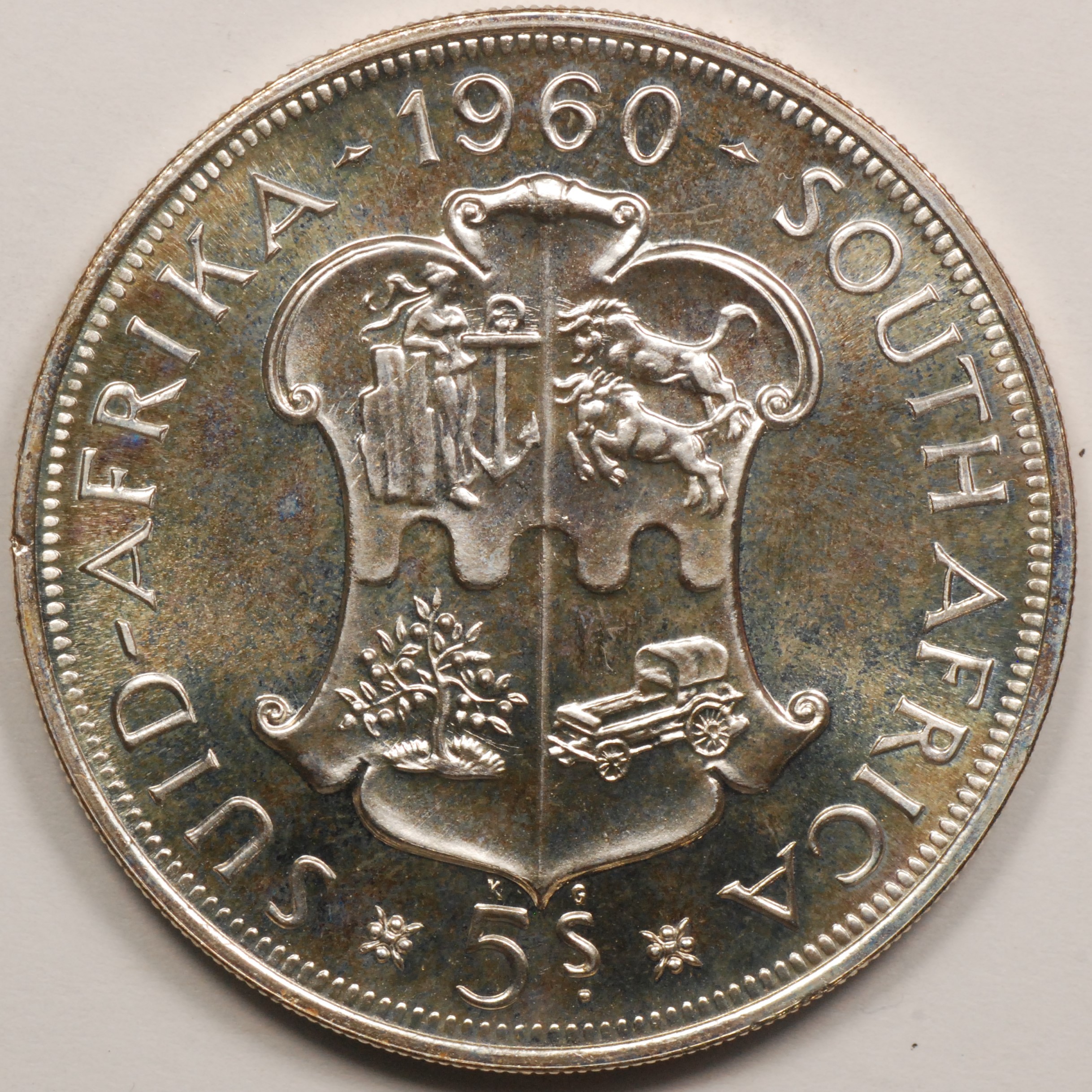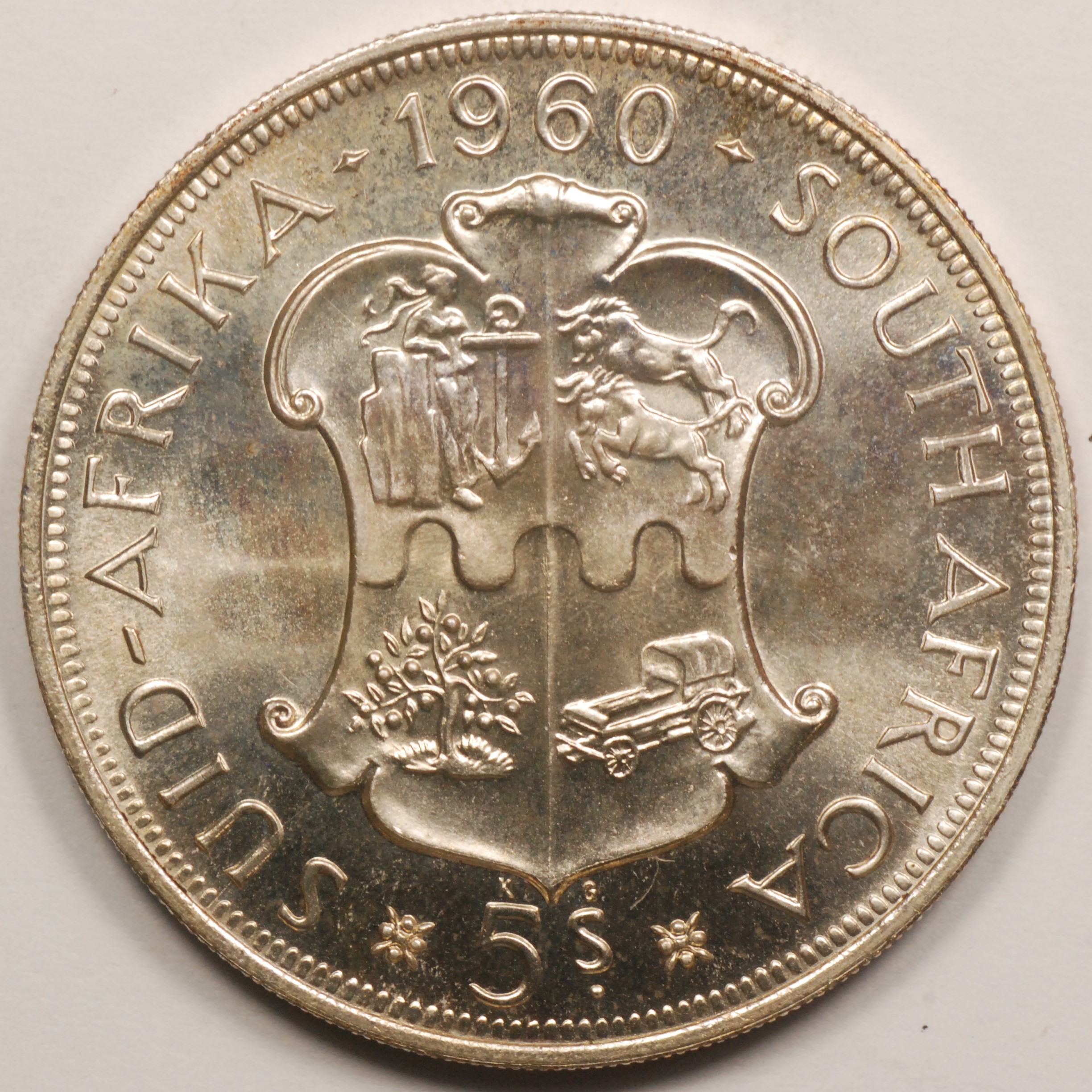 1960 | SOUTH AFRICA | 5 Shillings | Shield | Elizabeth II | 0.500 | 0.4546 | Silver | 55 | Toned, Bril. Uncirculated | $27.50 |