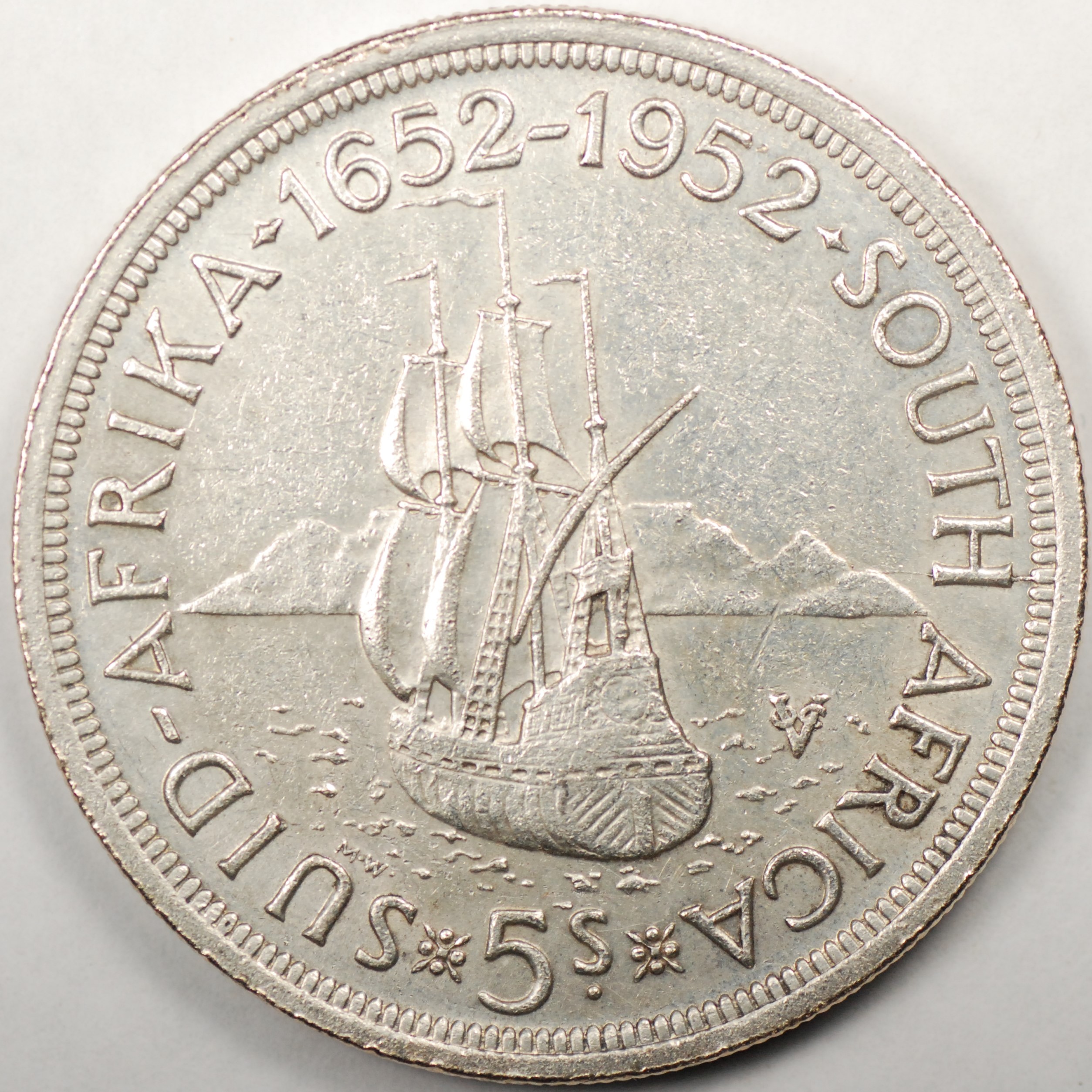 FC | 32035 | 1952 | SOUTH AFRICA | 5 Shillings | George V | Schooner in Harbor | 0.500 | 0.4545 | Silver | 41 | Bril. Uncirculated | $40.00 |