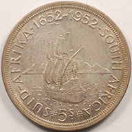 | FC | 39750 | 1952 | SOUTH AFRICA | 5 Shillings | George VI | 300th Anniv. of Founding of Capetown | 0.500 | 0.4546 | Silver | 41 | About Uncirculated | $24.00 | ||