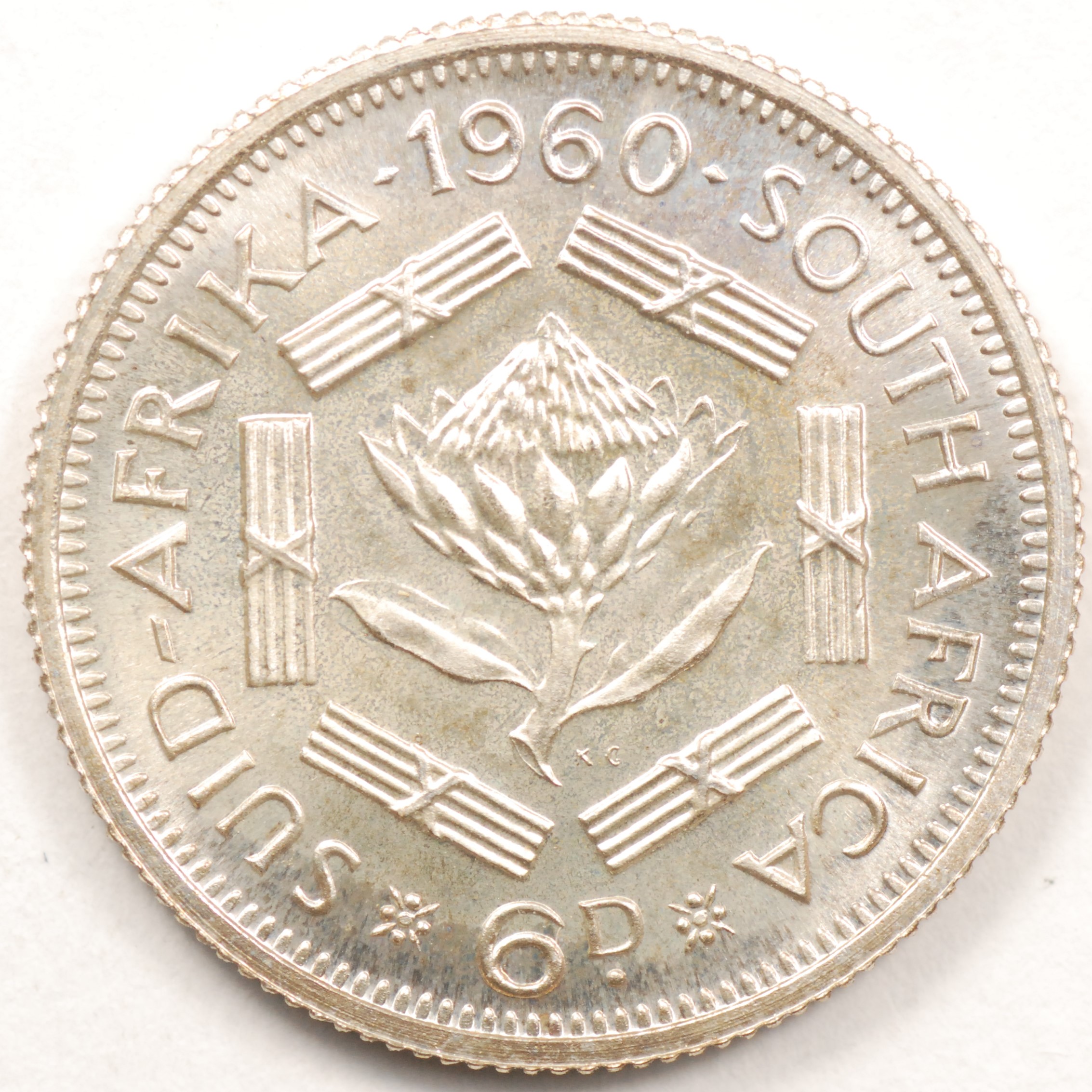 | FC | 19799 | 1960 | SOUTH AFRICA | 6 Pence | Protea Flower | Elizabeth II | 0.500 | 0.0455 | Silver | 48 | Proof-65 | $10.00 | |||