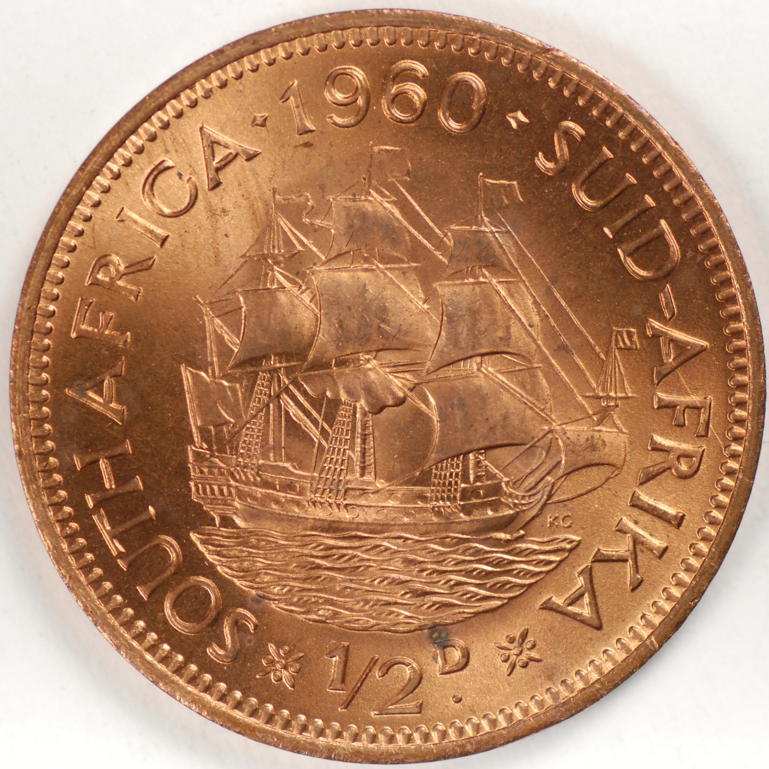 | FC | 26007 | 1960 | SOUTH AFRICA | 1/2 Penny | Dromedarius Ship | Elizabeth II | Bronze | 45 | Bril. Uncirculated | $15.00 | |||||