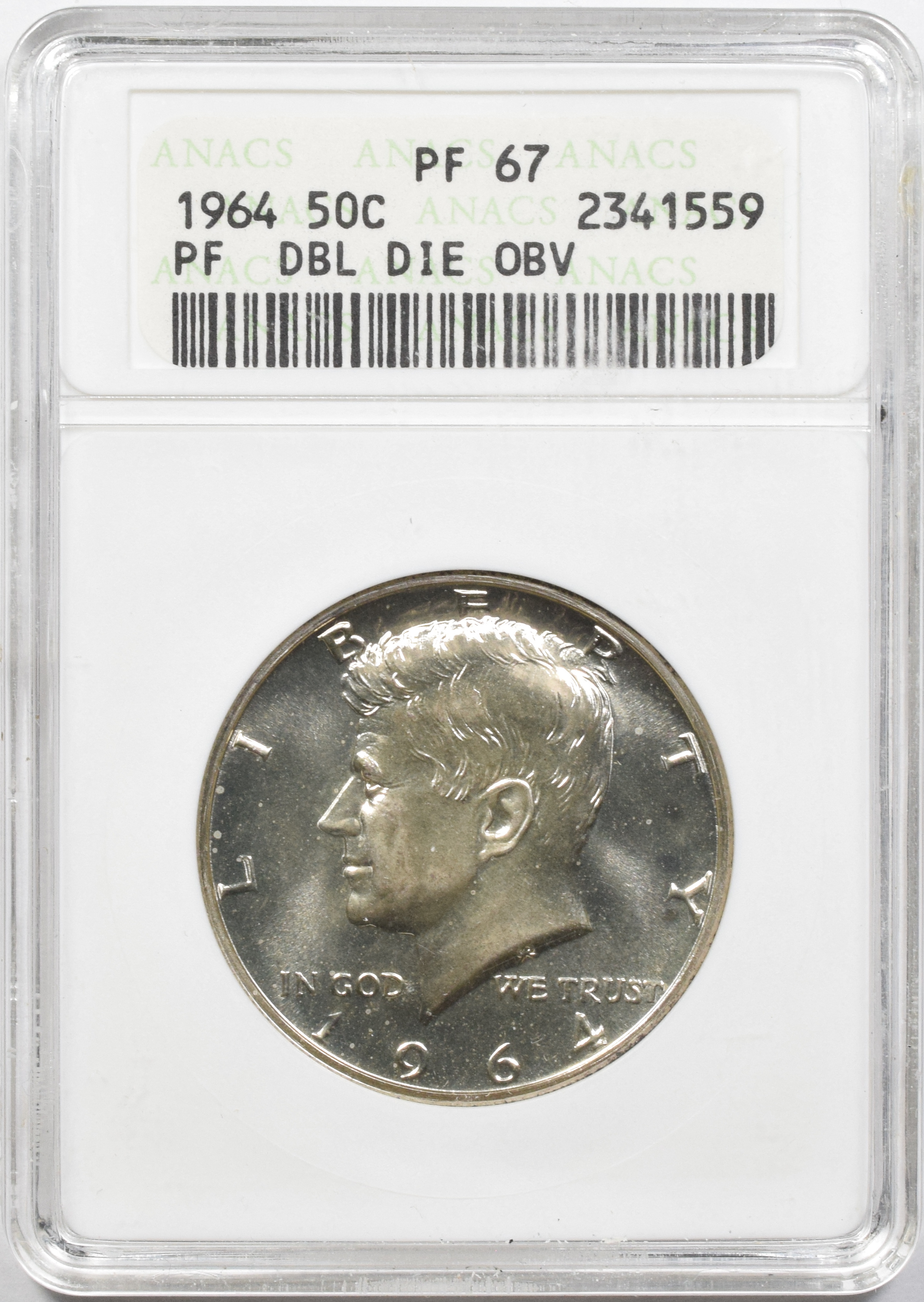 | 2341559 H S | 1964 | Kennedy Half Dollar | Doubled Die Obverse FS-50-1964-104 ANACS Certificate 2341559 |