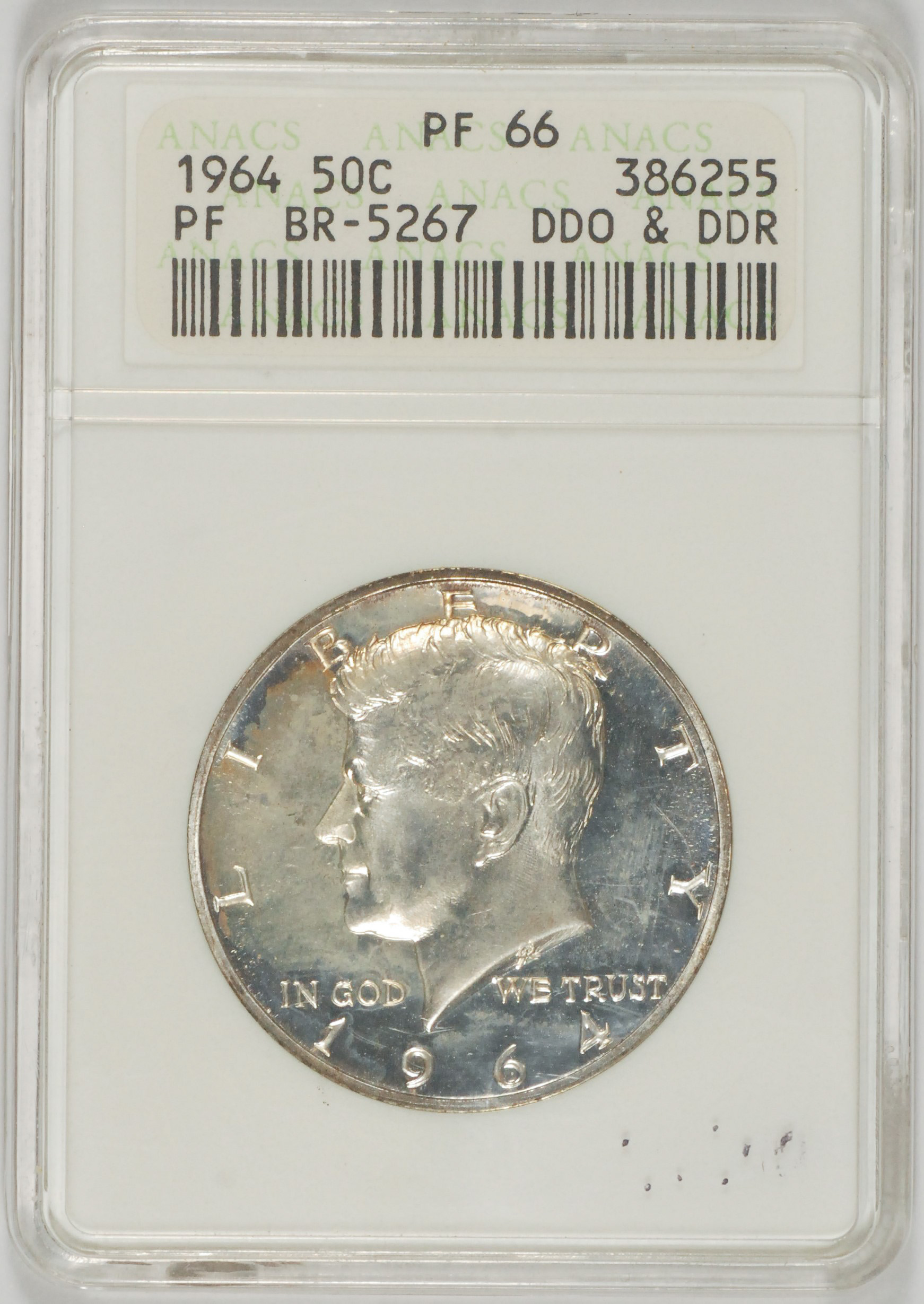 | 386255 H R | 1964 | Kennedy Half Dollar | Accented Hair Breen-5267 Doubled Die Obverse & Doubled Die Reverse ANACS Certificate 386255 |