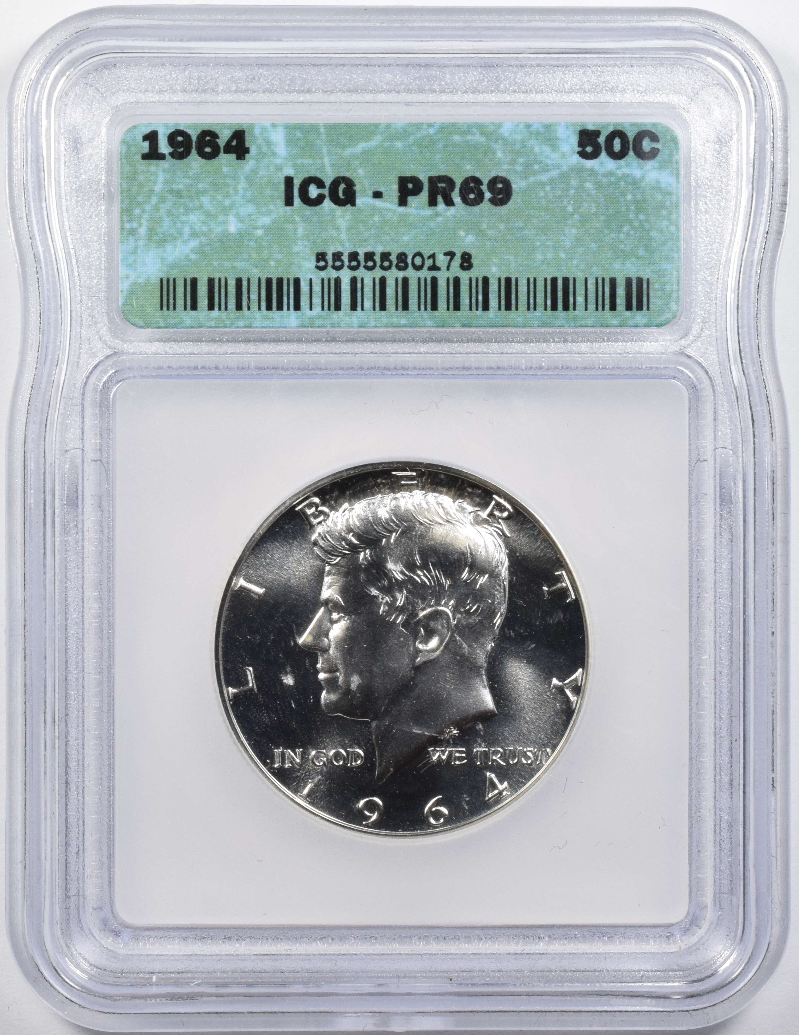 | 90036 H R | 1964 | Kennedy Half Dollar | ICG Certificate 5555580178 | Proof-69 | $130.00 | ||