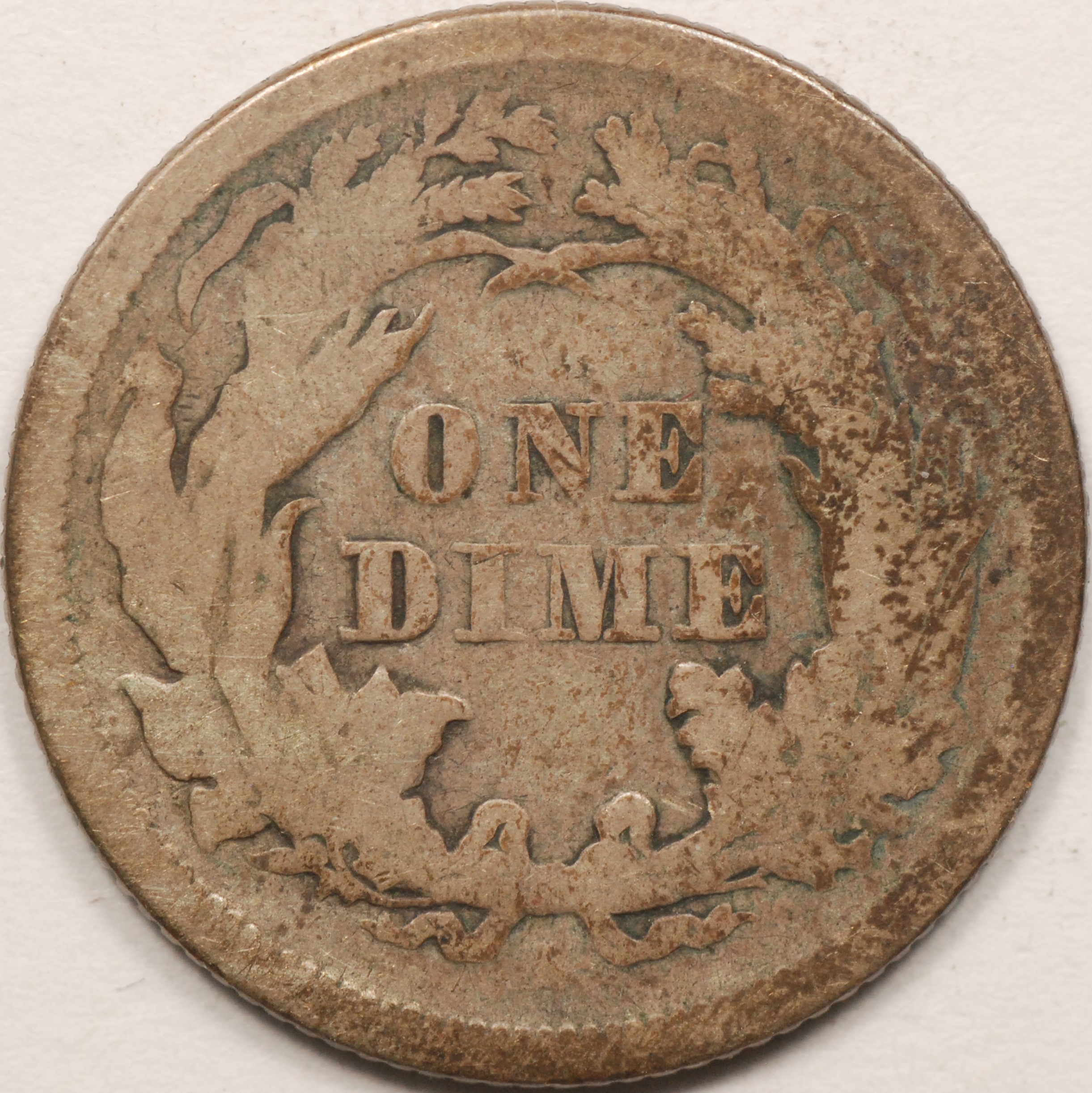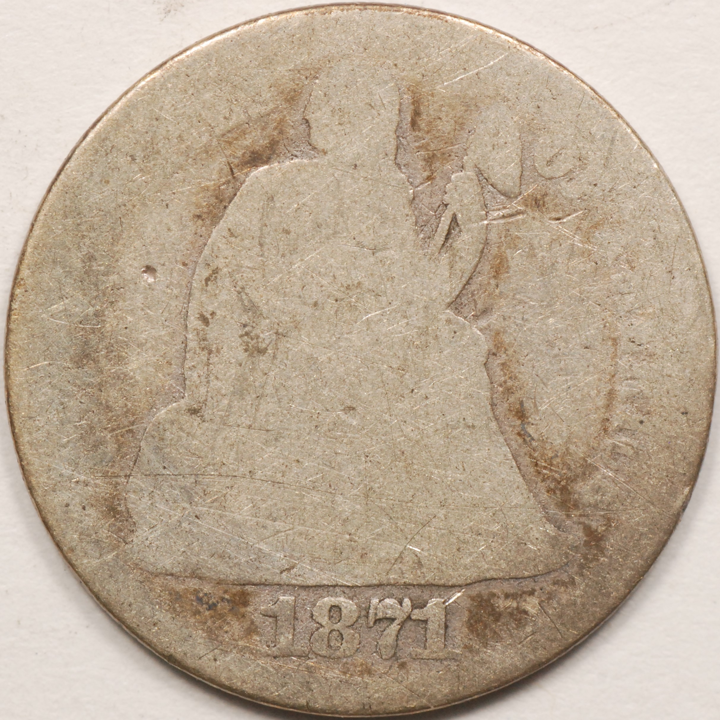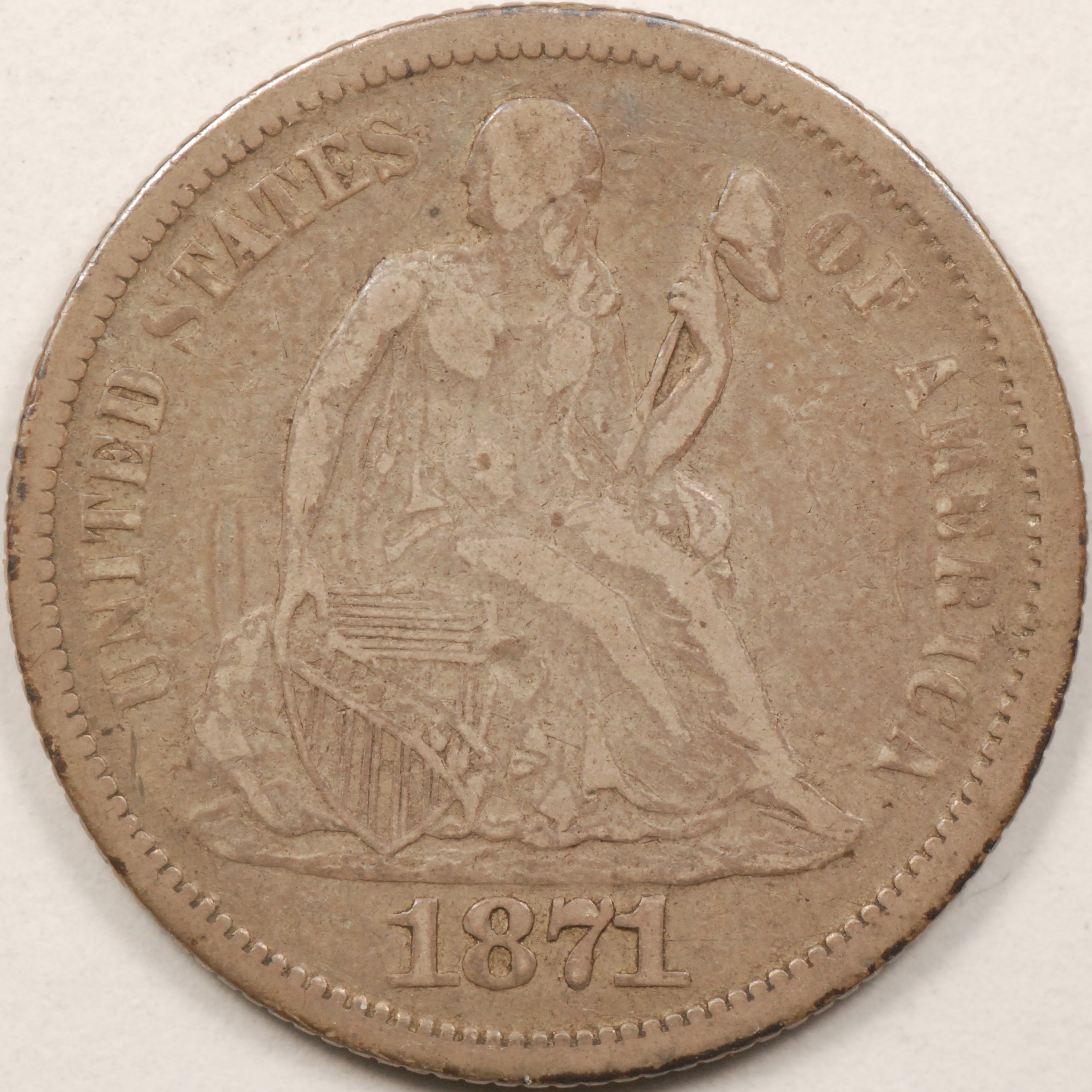 | 63648 R | 1871 | Seated Liberty Dime | Fine | $18.00 | |||