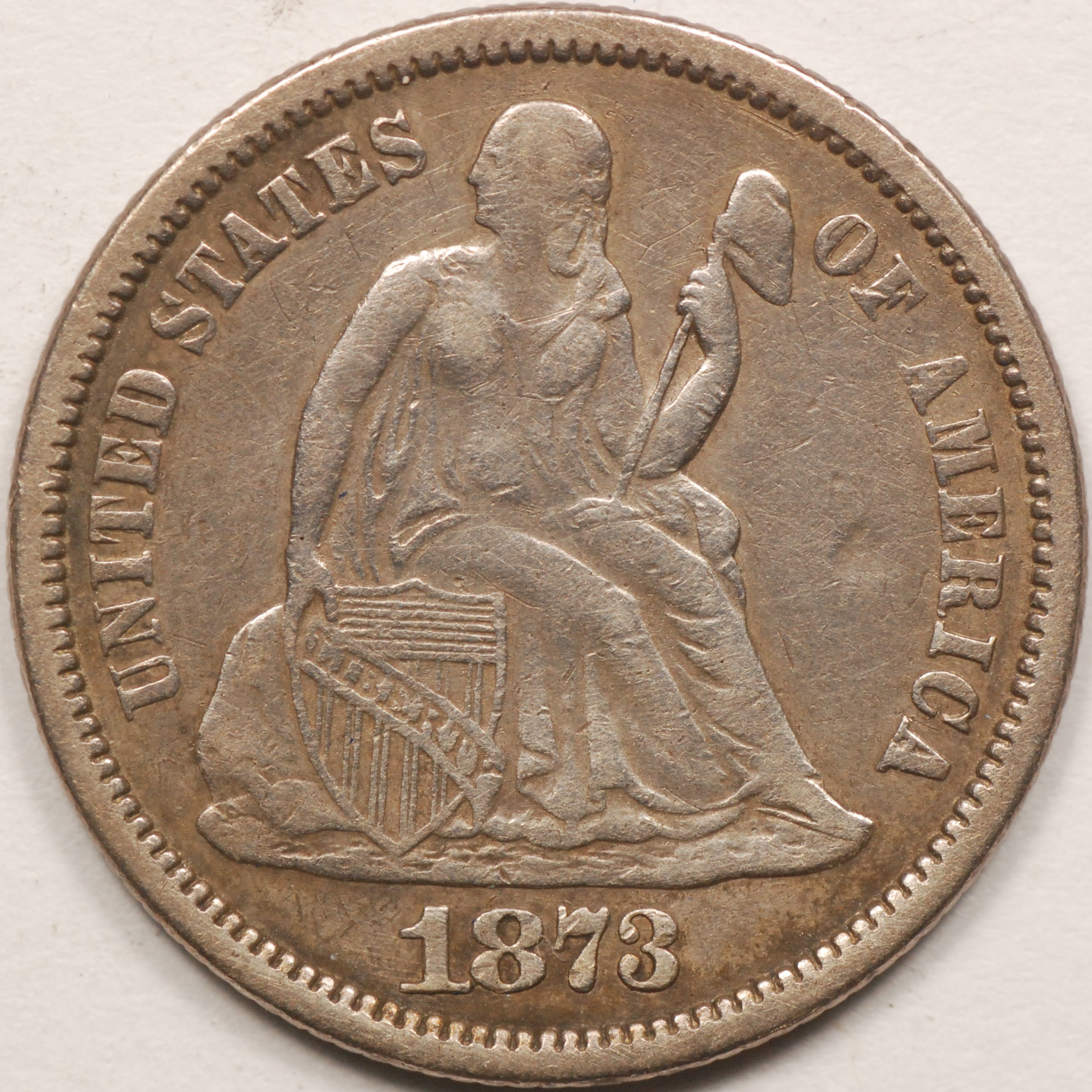 | 64045 R | 1873 | Seated Liberty Dime | No Arrows, Closed 3 | Very Fine | $54.00 | ||
