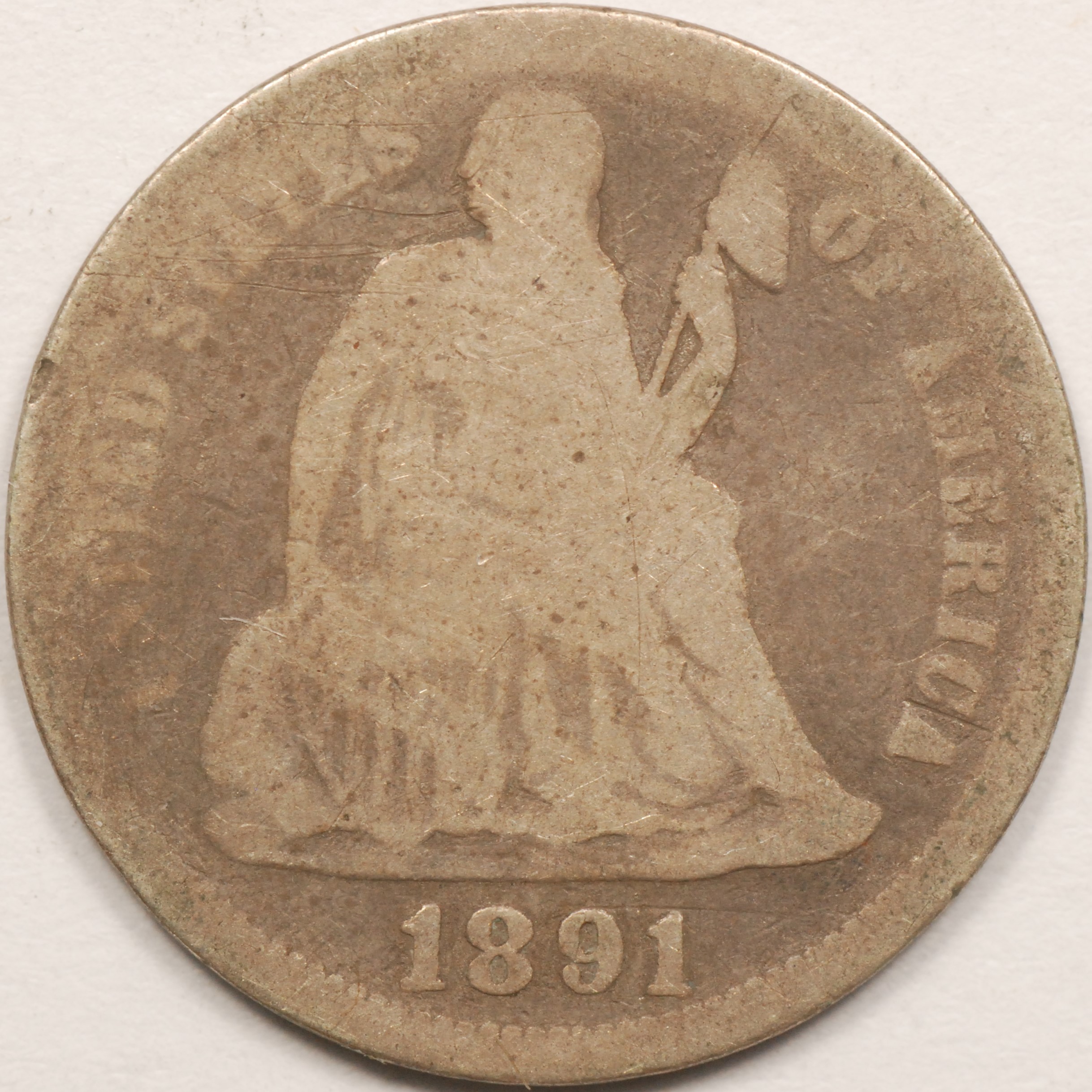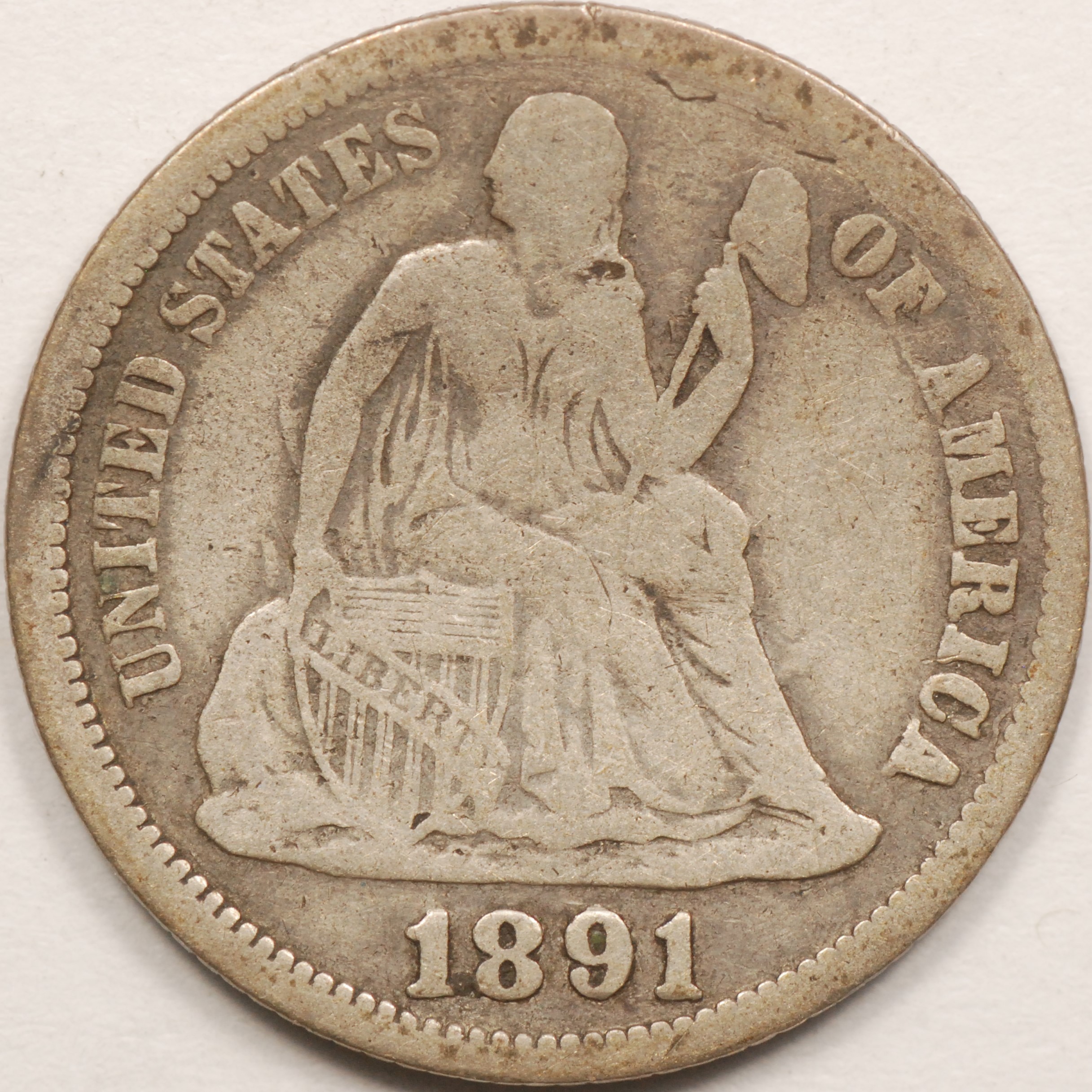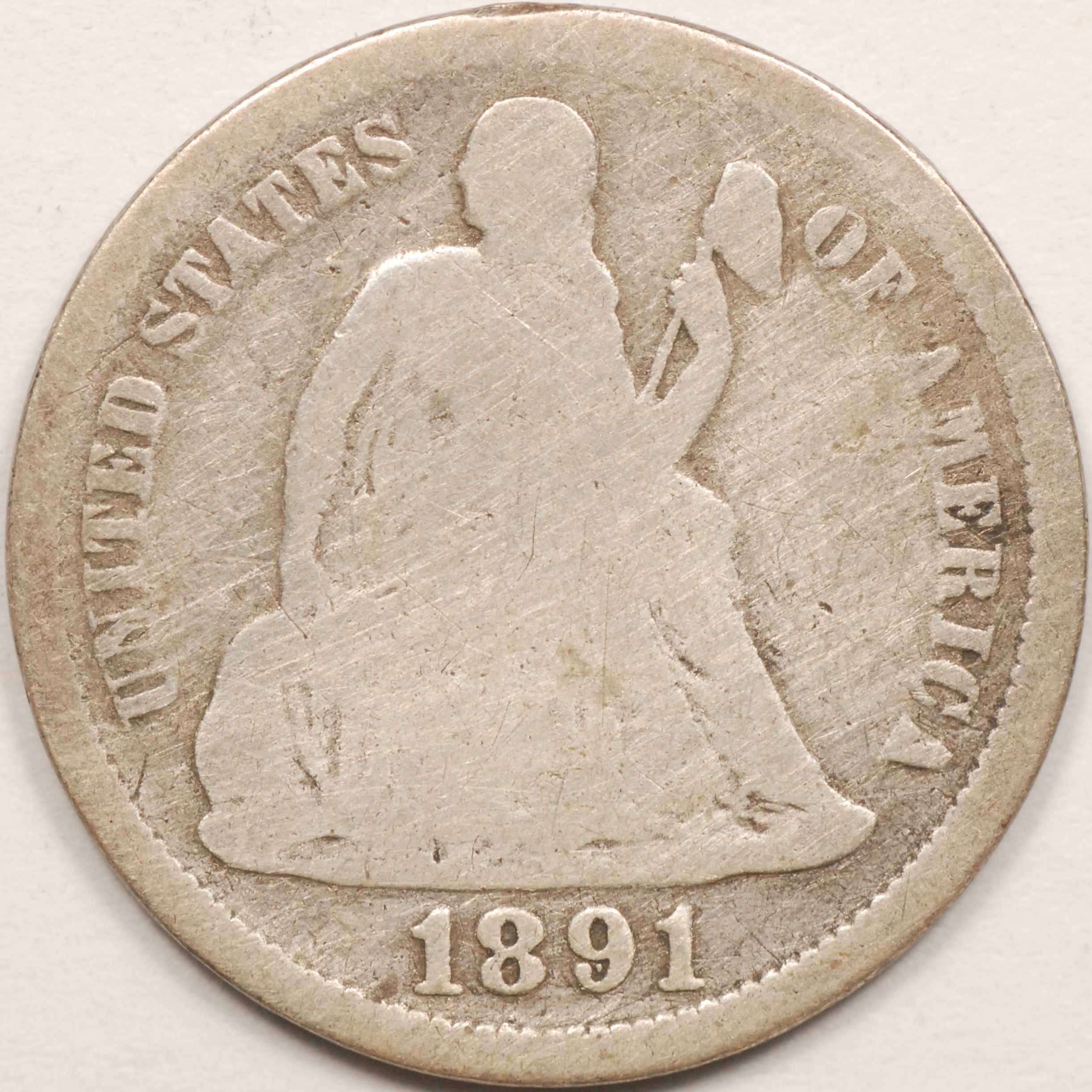 | 59797 R | 1891 | Seated Liberty Dime | Good | $15.00 | |||