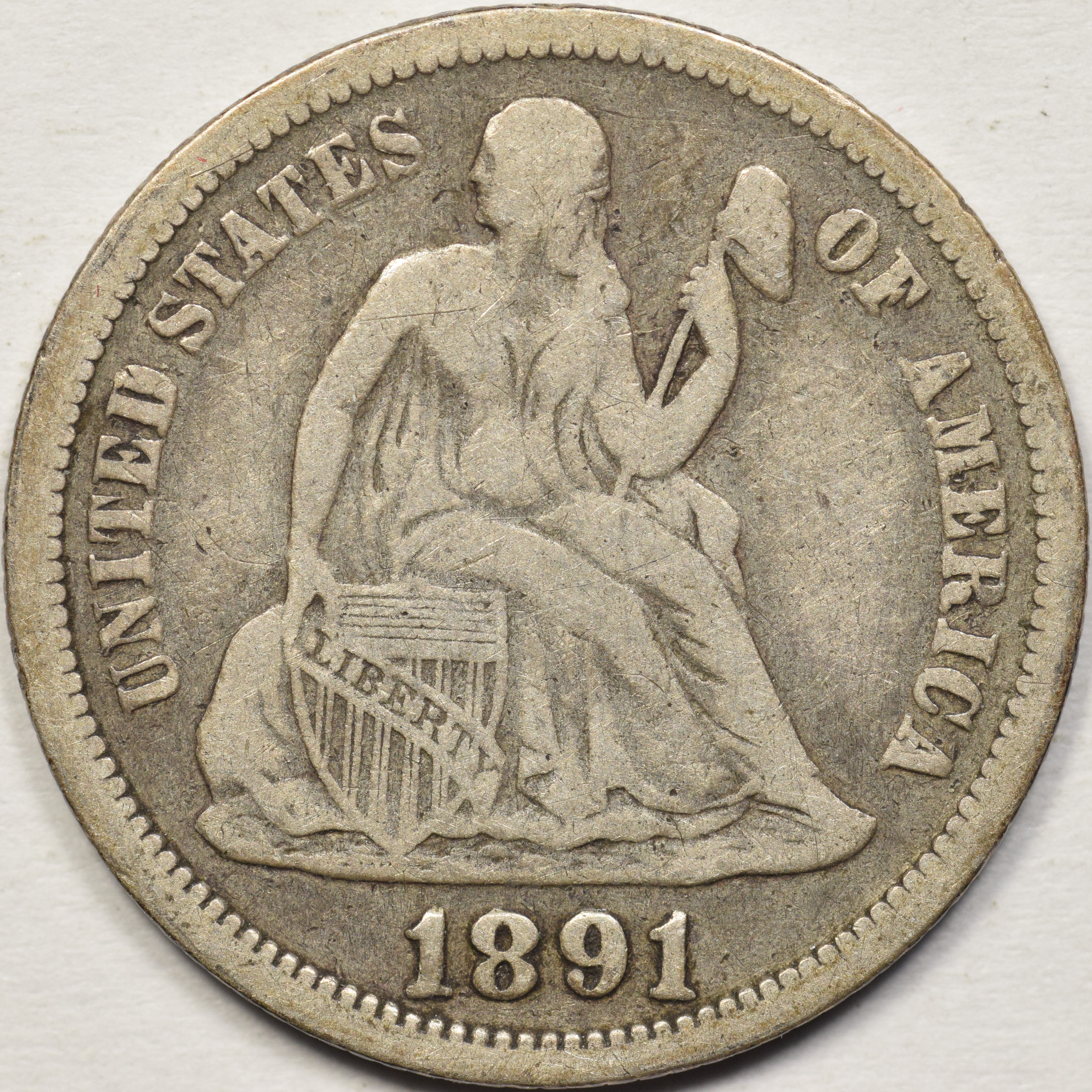 | 64057 R | 1891 | Seated Liberty Dime | Very Good | $16.00 | |||