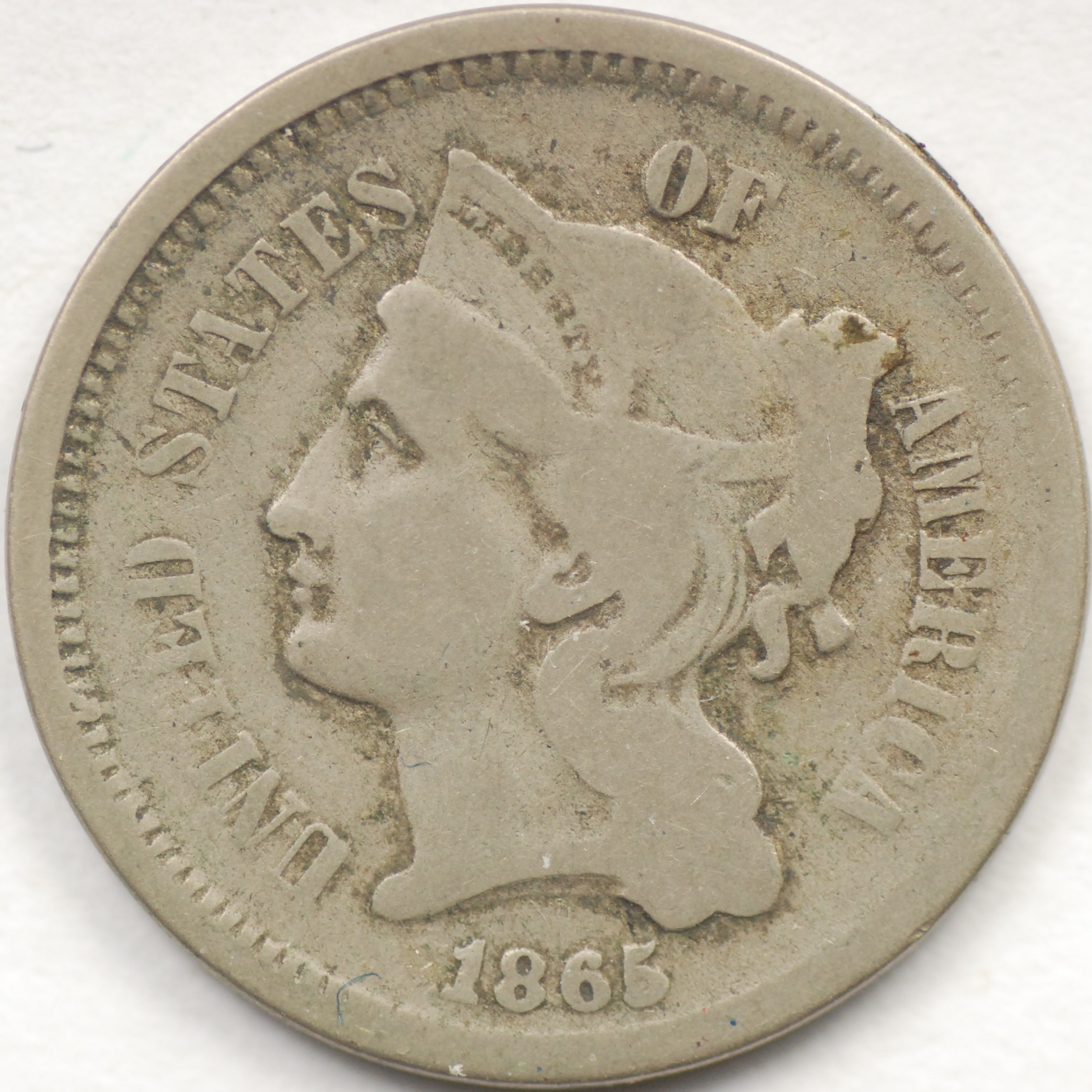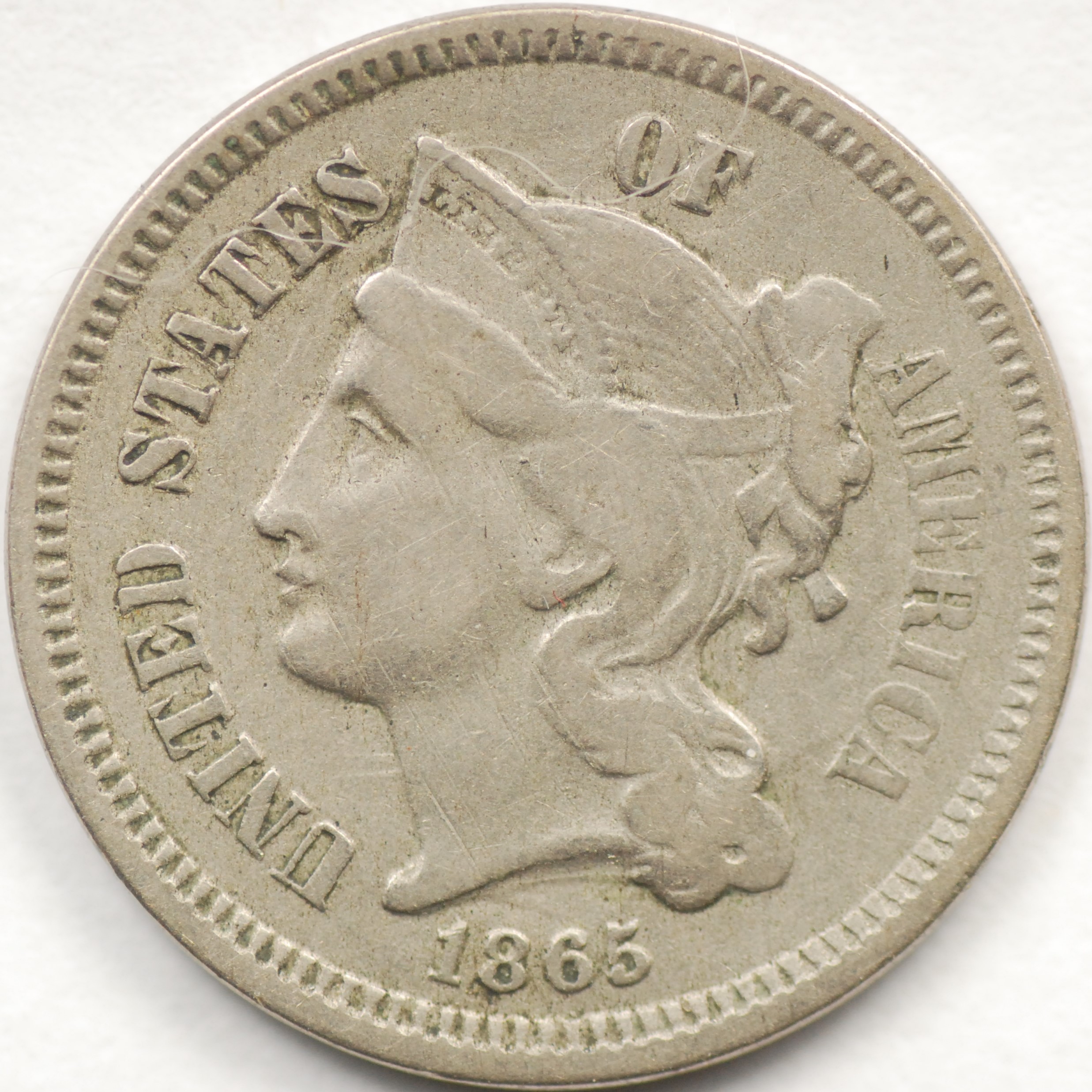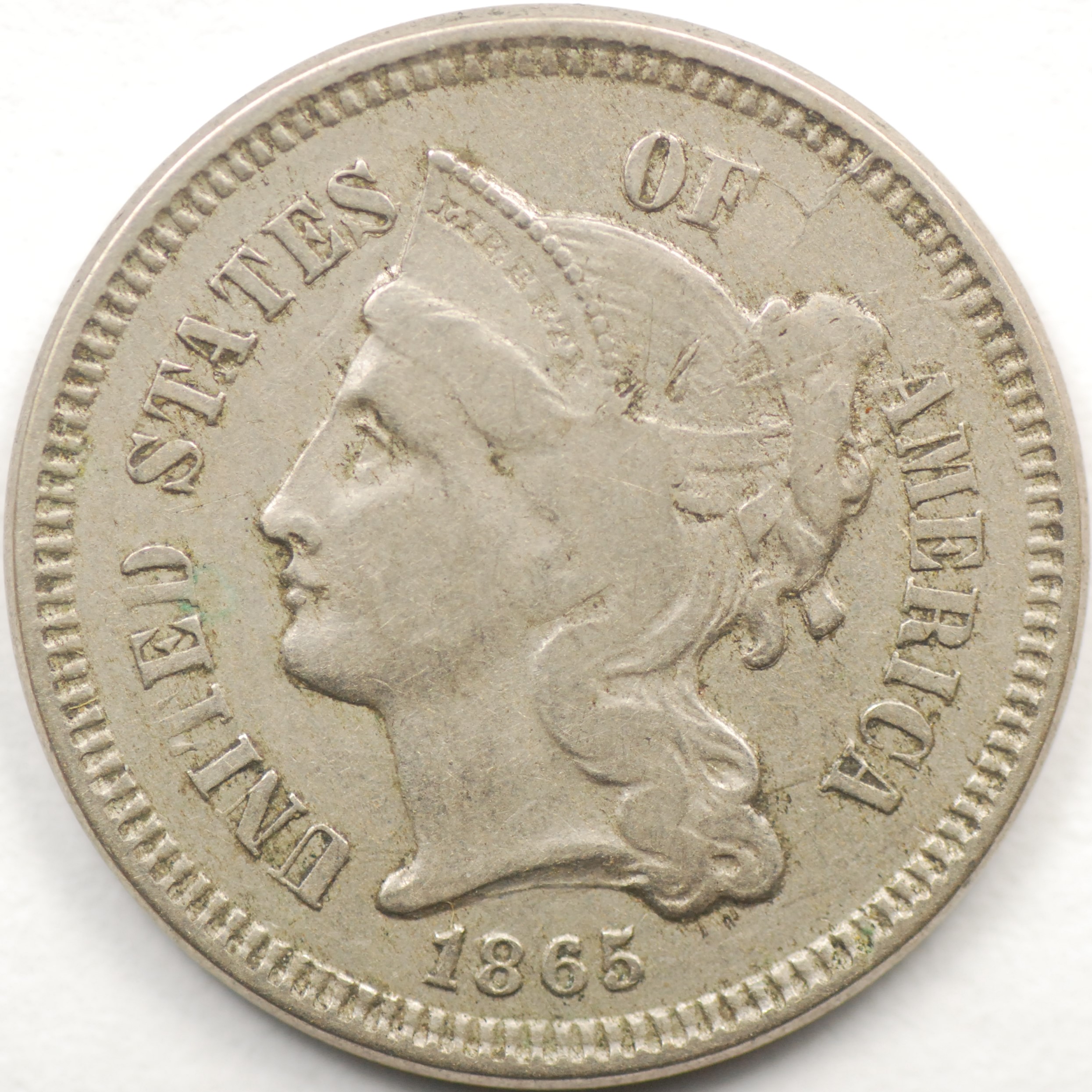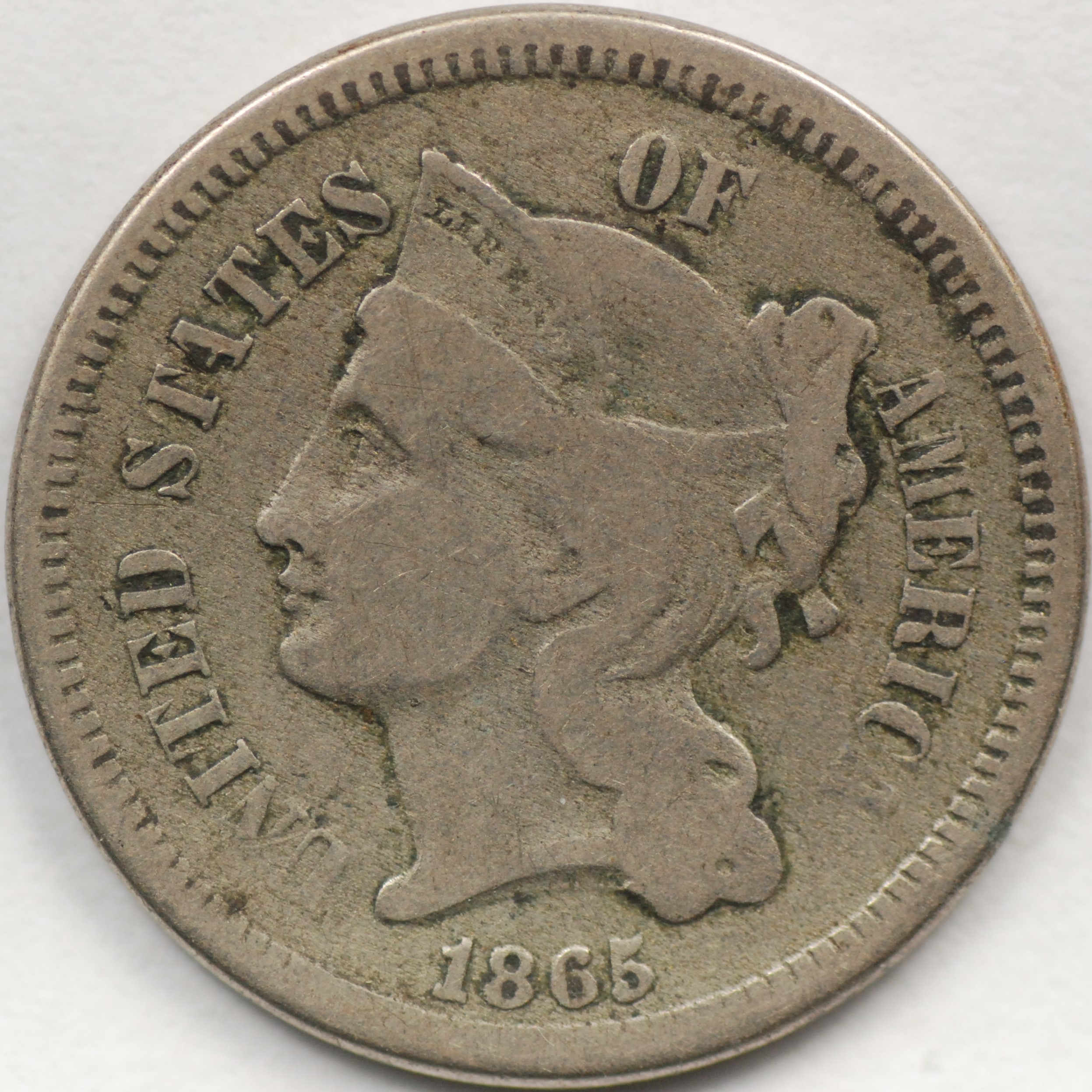 | 56113 R | 1865 | Copper-Nickel Three Cents | Very Fine | $28.00 | |||