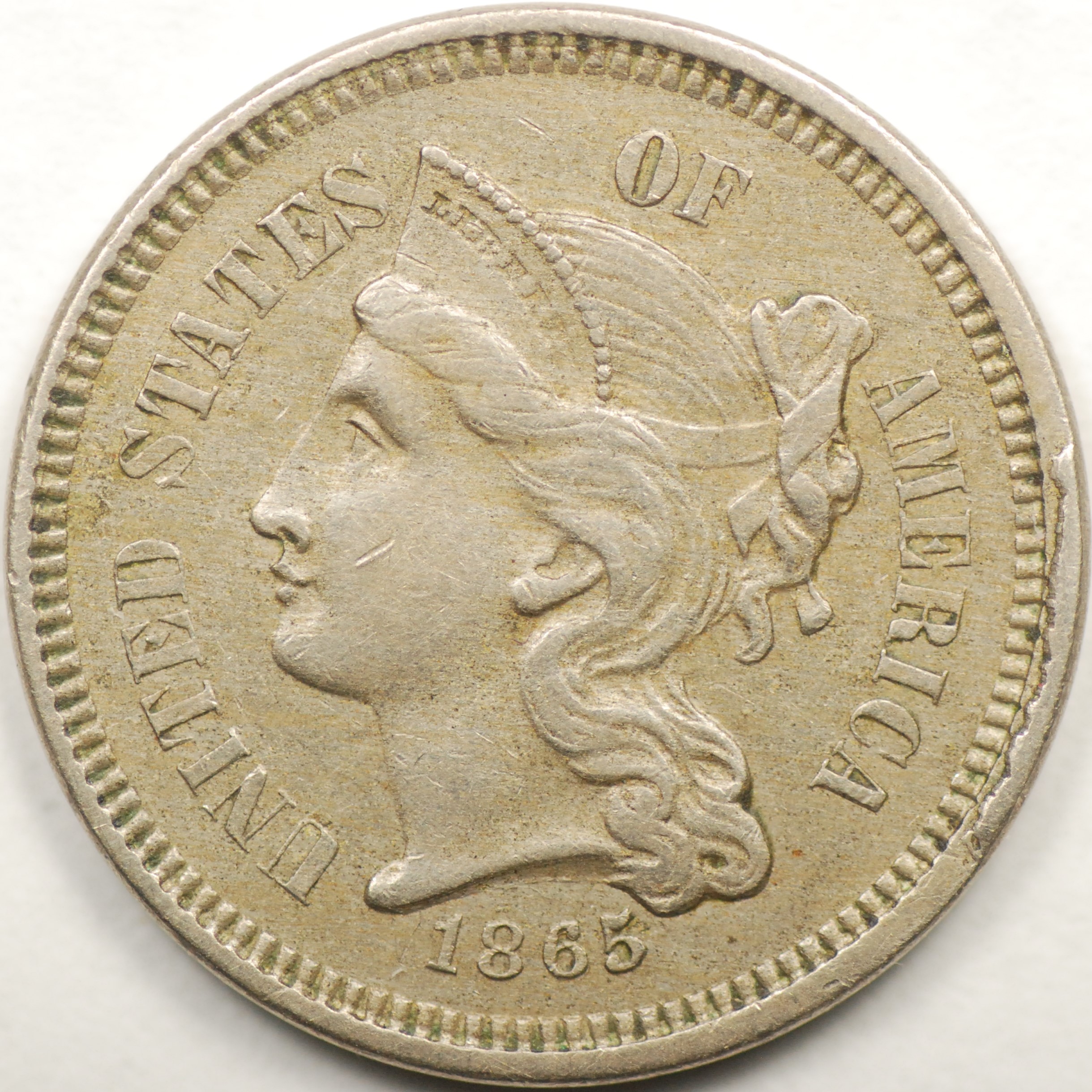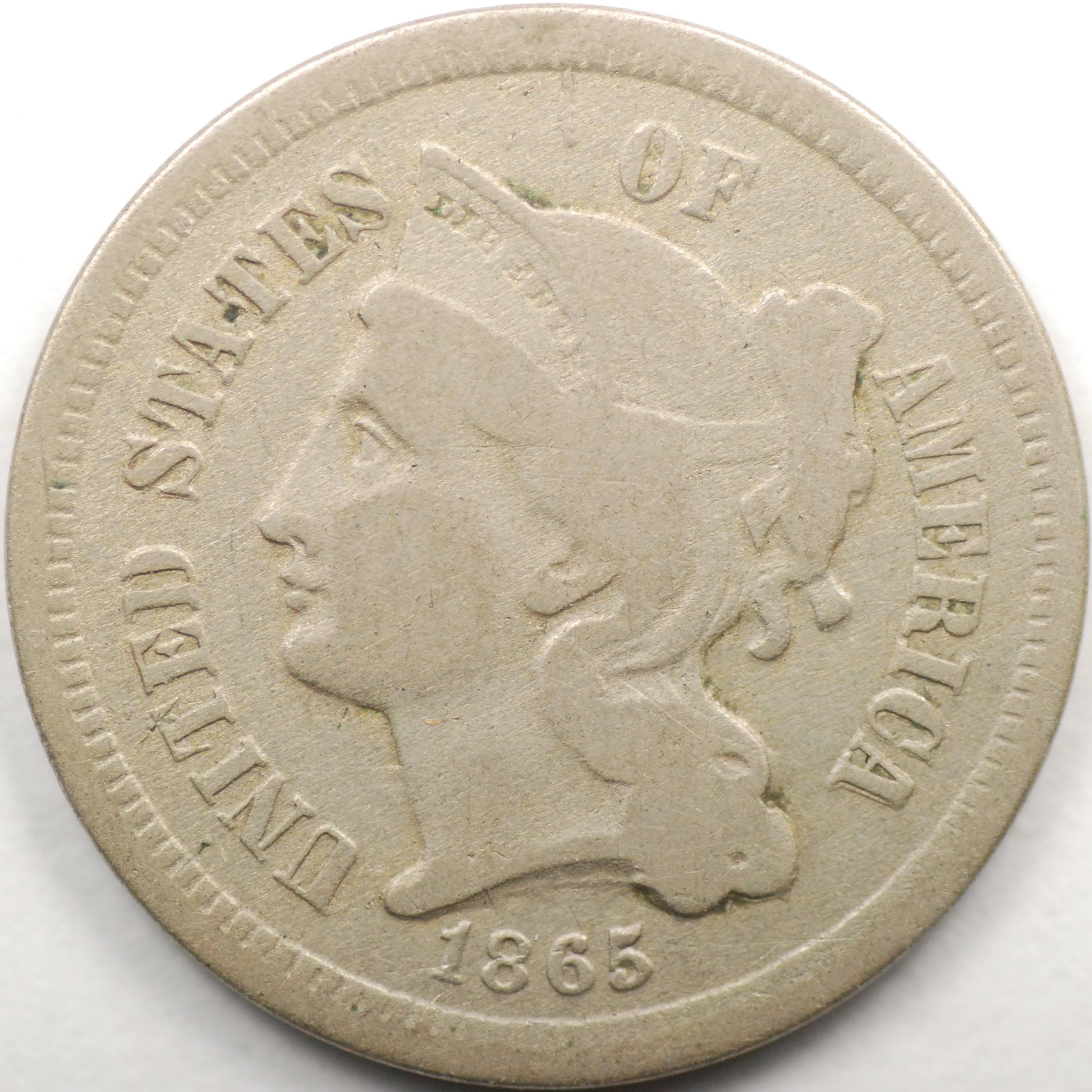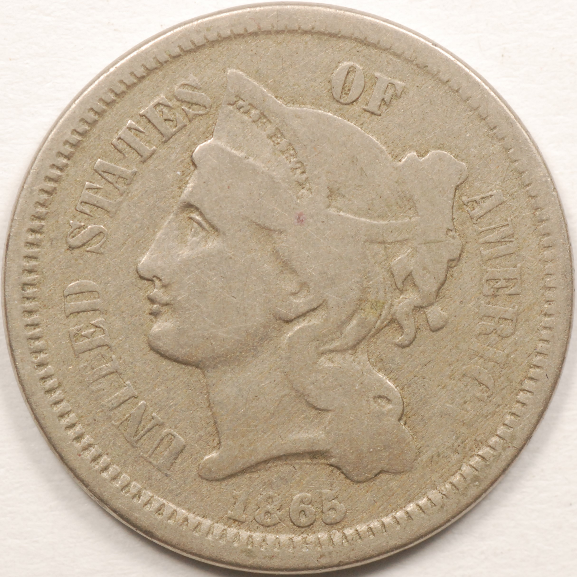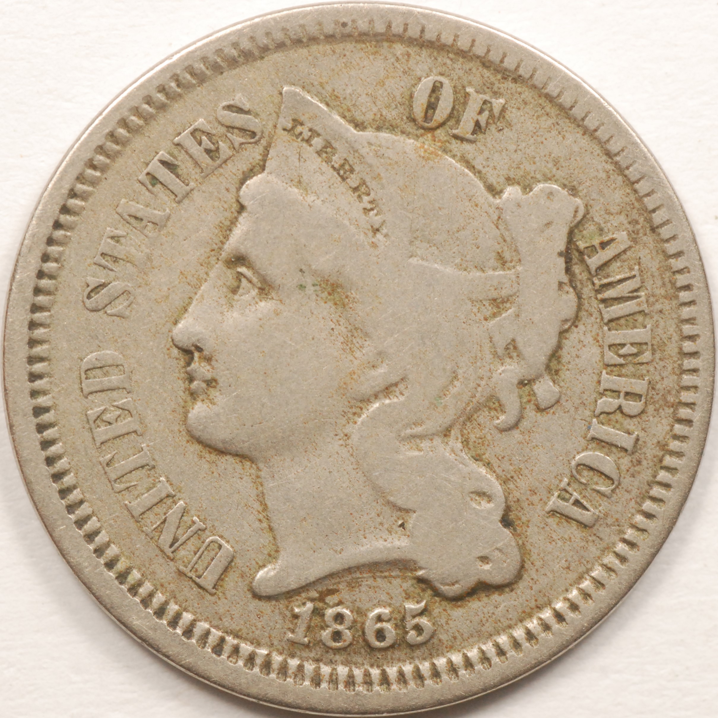 | 56113 R | 1865 | Copper-Nickel Three Cents | Very Fine | $28.00 | |||
