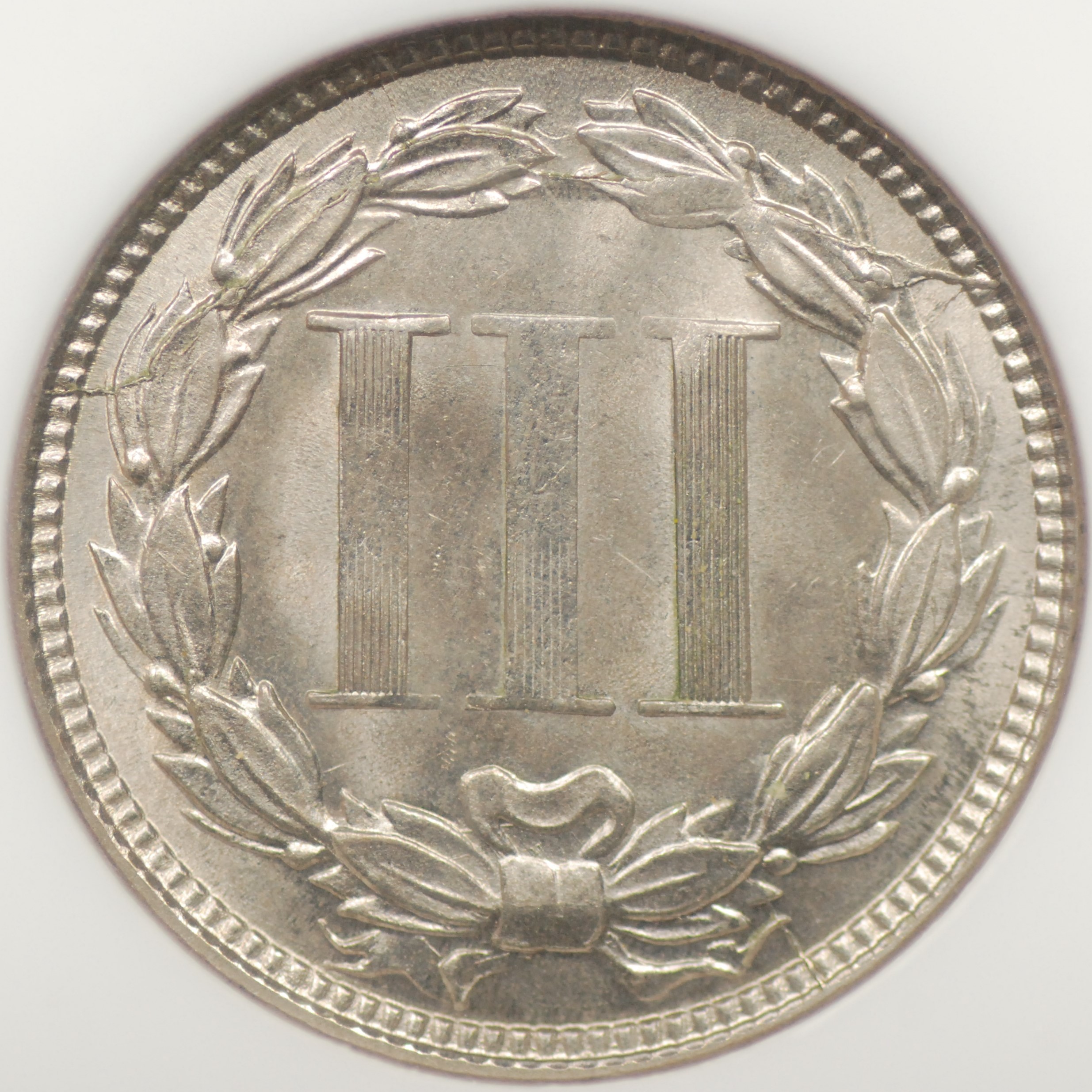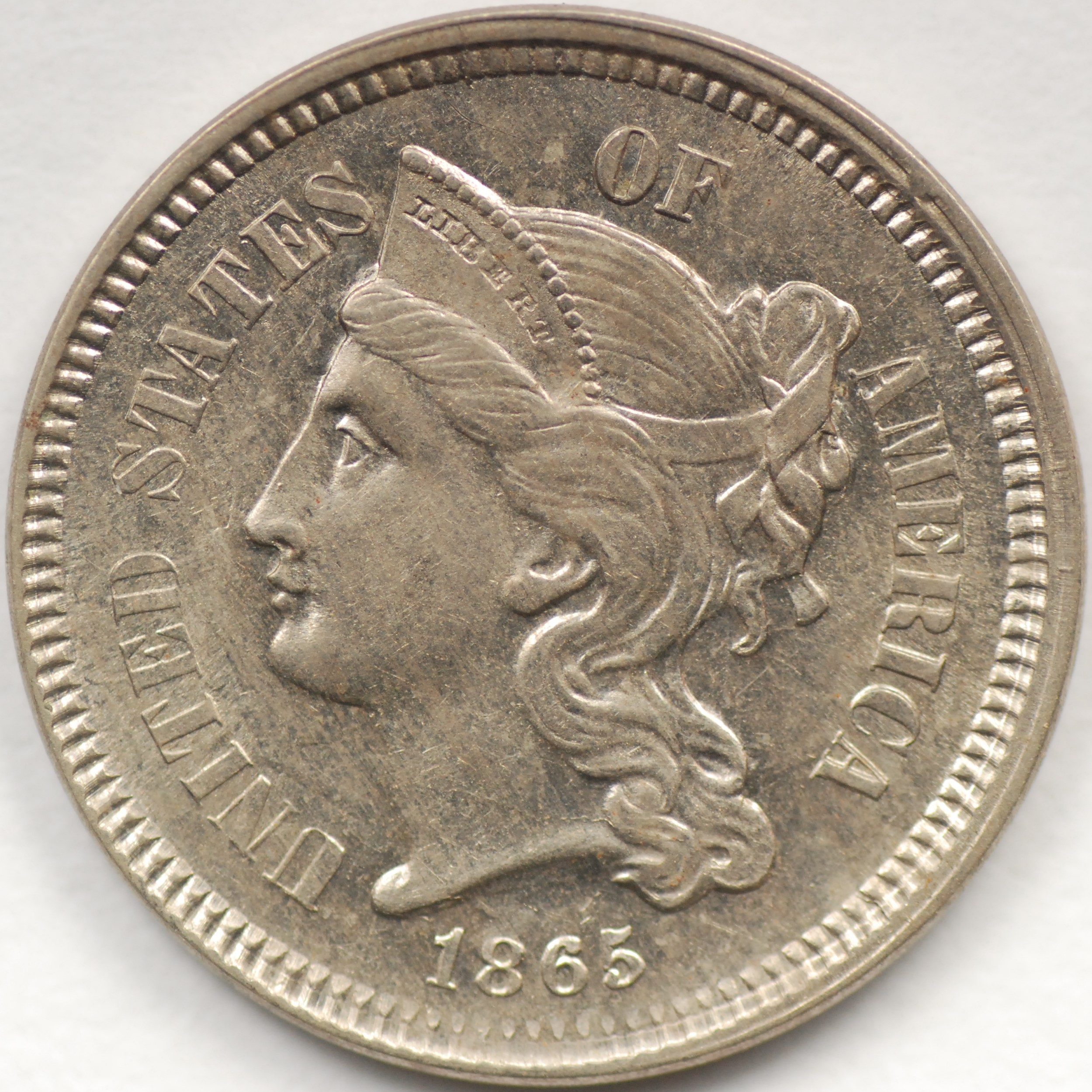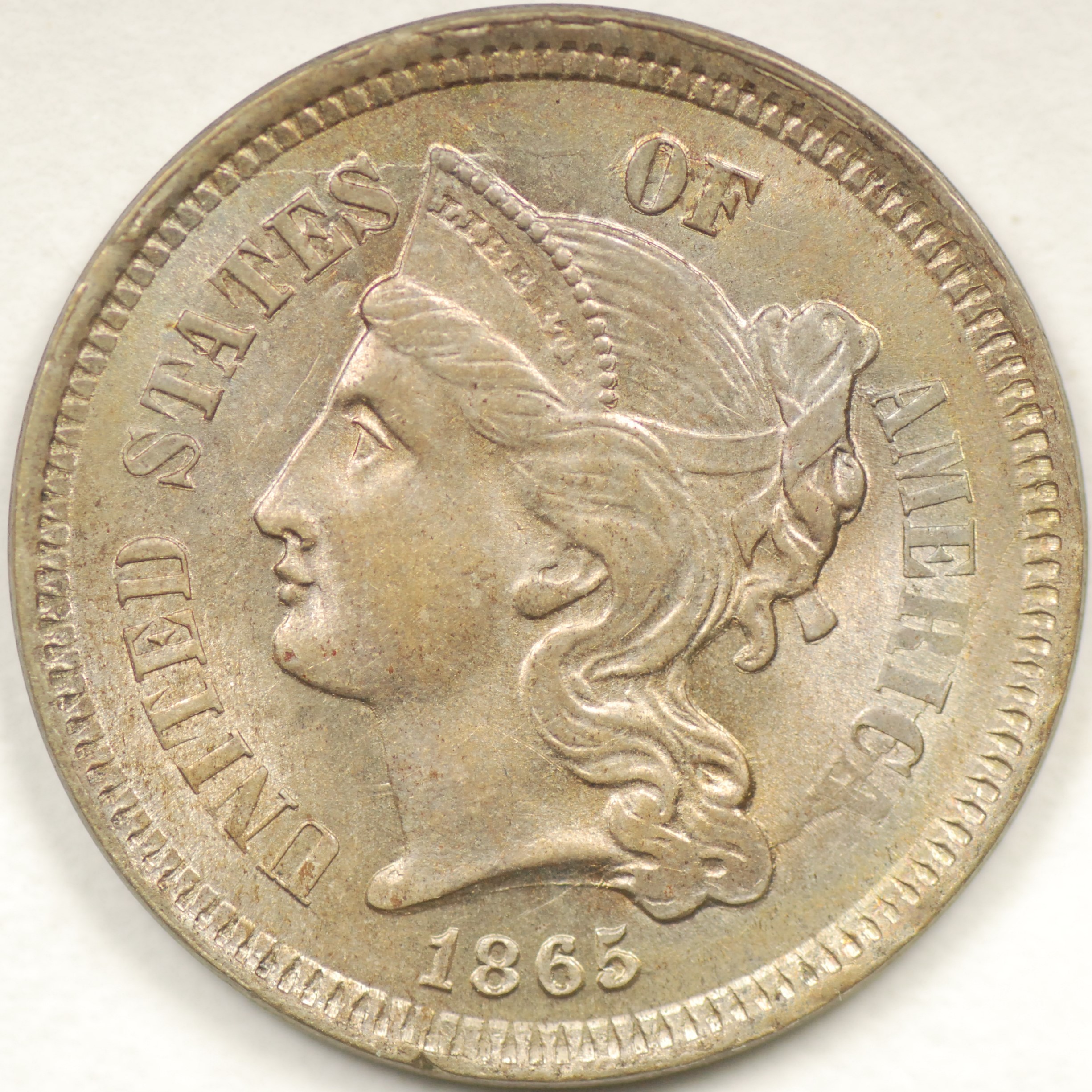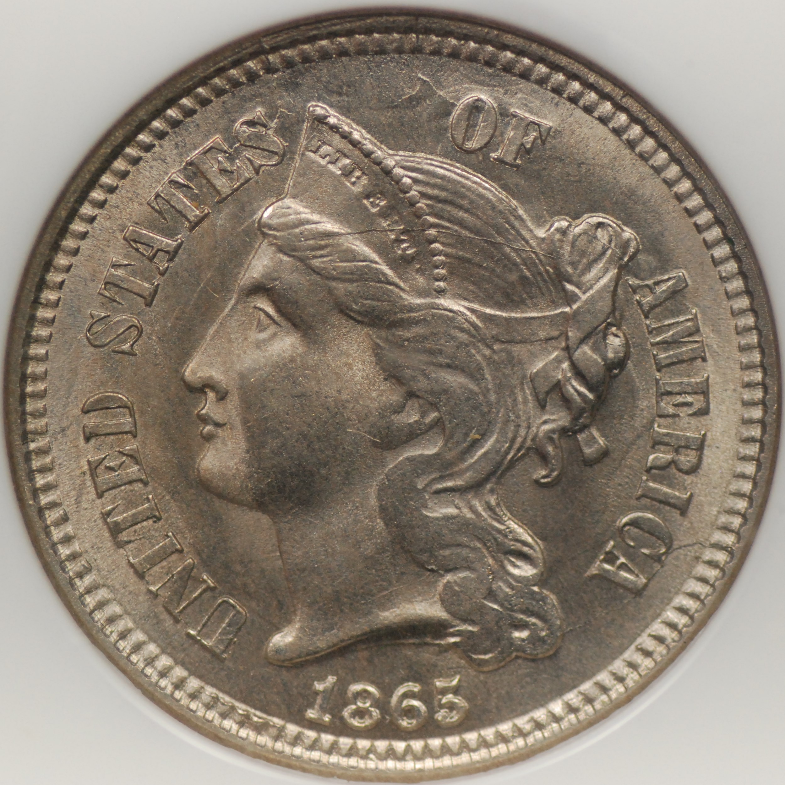 | 81 S | 1865 | Copper-Nickel Three Cents | Repunched Date, FS-3N-1865-304 | MS-63 | $270.00 | ||