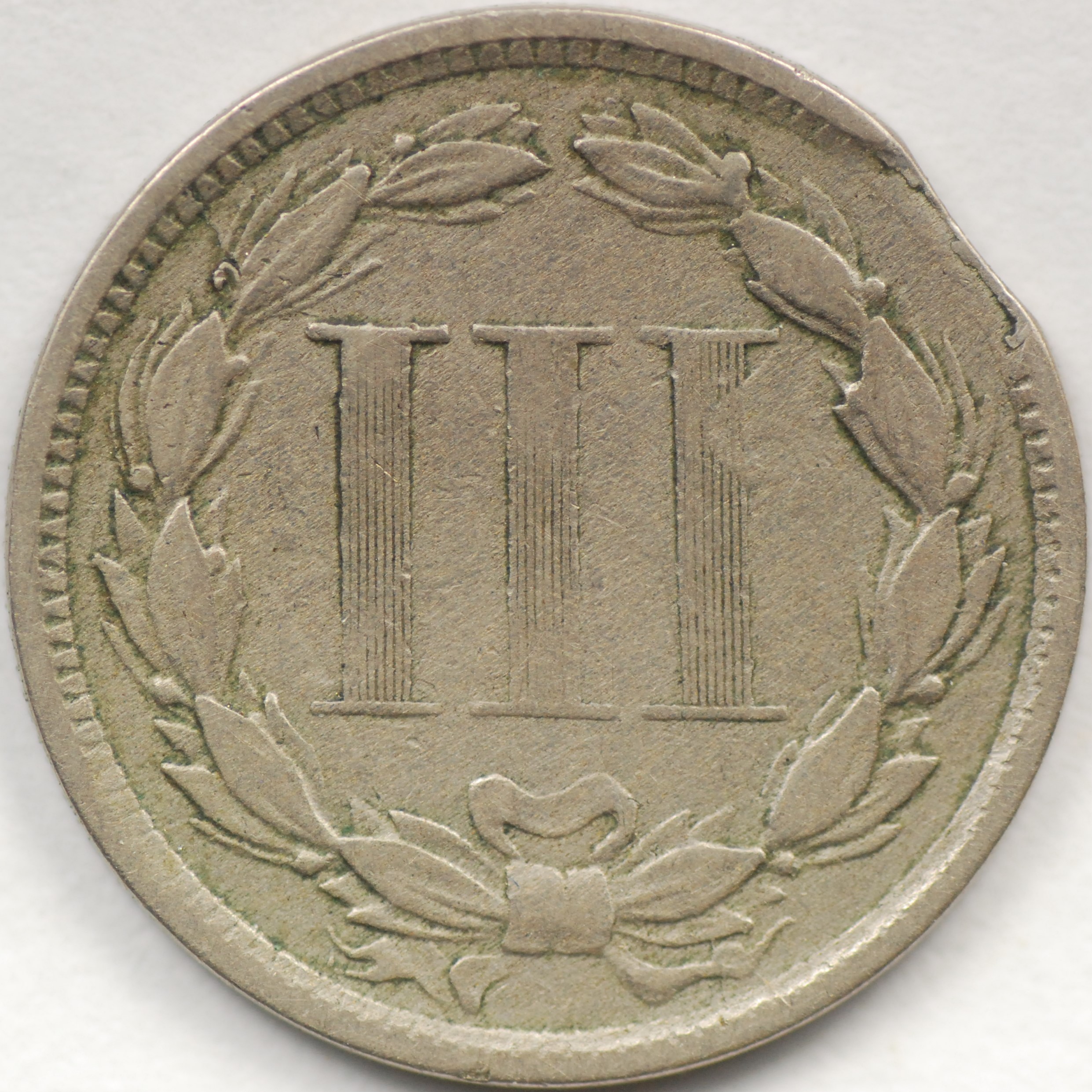 | 7 R | 1865 | Copper-Nickel Three Cents | ERROR: Clipped Planchet | Very Fine | $50.00 | ||