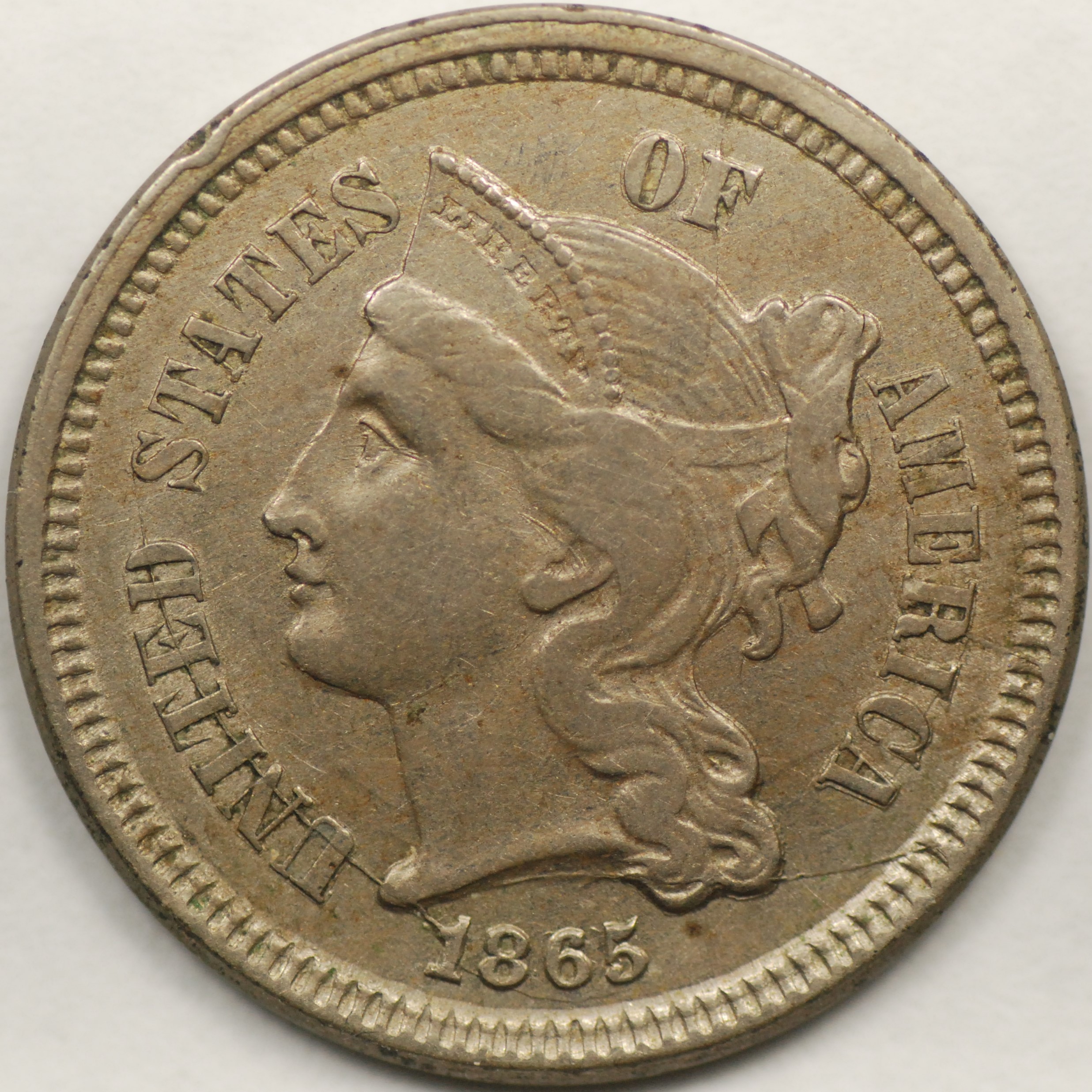 | 78393 R | 1865 | Copper-Nickel Three Cents | ERROR: Rim Cud on Date | Extremely Fine | $65.00 | ||